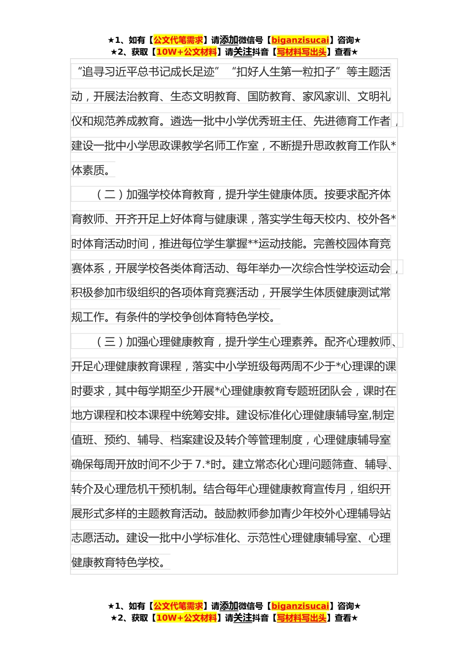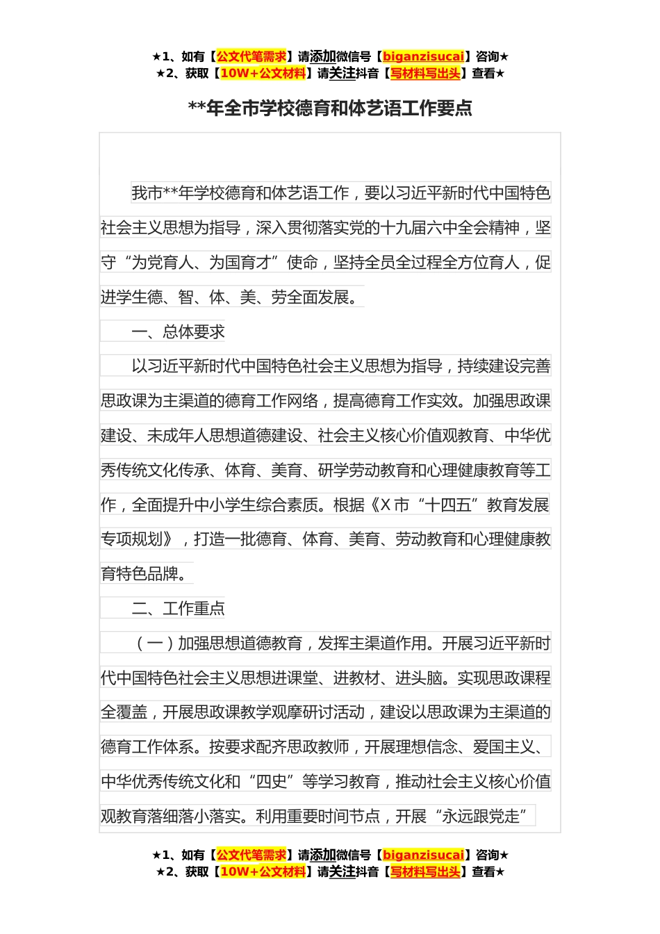 ★1、如有【公文代笔需求】请添加微信号【biganzisucai】咨询★★2、获取【10W+公文材料】请关注抖音【写材料写出头】查看★**年全市学校德育和体艺语工作要点我市**年学校德育和体艺语工作,要以习近平新时代中国特色社会主义思想为指导,深入贯彻落实党的十九届六中全会精神,坚守“为党育人、为国育才”使命,坚持全员全过程全方位育人,促进学生德、智、体、美、劳全面发展。一、总体要求以习近平新时代中国特色社会主义思想为指导,持续建设完善思政课为主渠道的德育工作网络,提高德育工作实效。加强思政课建设、未成年人思想道德建设、社会主义核心价值观教育、中华优秀传统文化传承、体育、美育、研学劳动教育和心理健康教育等工作,全面提升中小学生综合素质。根据《X市“十四五”教育发展专项规划》,打...