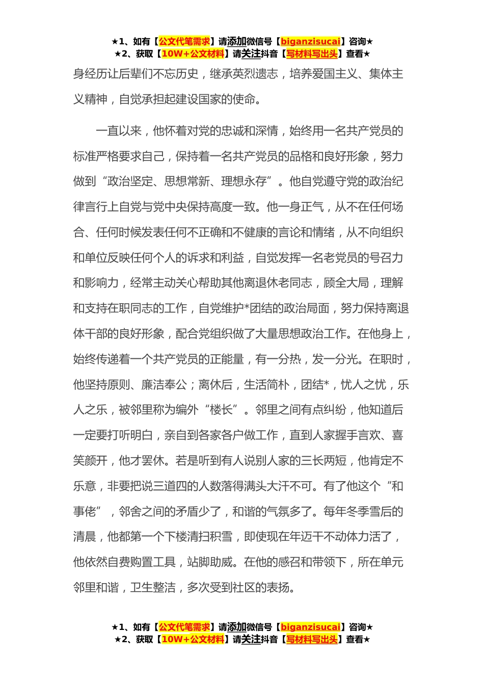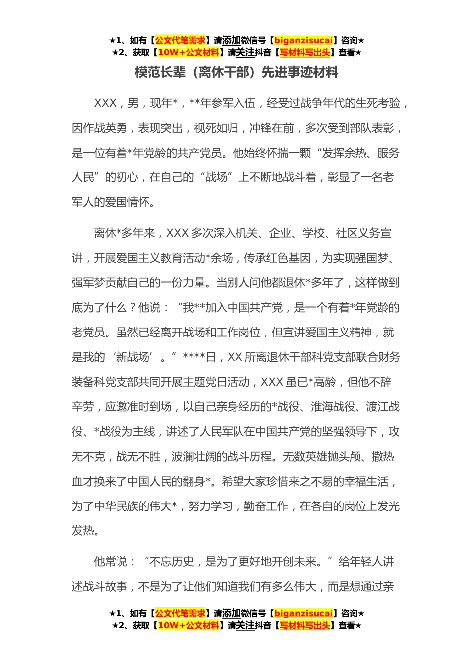 ★1、如有【公文代笔需求】请添加微信号【biganzisucai】咨询★★2、获取【10W+公文材料】请关注抖音【写材料写出头】查看★模范长辈(离休干部)先进事迹材料XXX,男,现年*,**年参军入伍,经受过战争年代的生死考验,因作战英勇,表现突出,视死如归,冲锋在前,多次受到部队表彰,是一位有着*年党龄的共产党员。他始终怀揣一颗“发挥余热、服务人民”的初心,在自己的“战场”上不断地战斗着,彰显了一名老军人的爱国情怀。离休*多年来,XXX多次深入机关、企业、学校、社区义务宣讲,开展爱国主义教育活动*余场,传承红色基因,为实现强国梦、强军梦贡献自己的一份力量。当别人问他都退休*多年了,这样做到底为了什么?他说:“我**加入中国共产党,是一个有着*年党龄的老党员。虽然已经离开战场和工作岗位,...