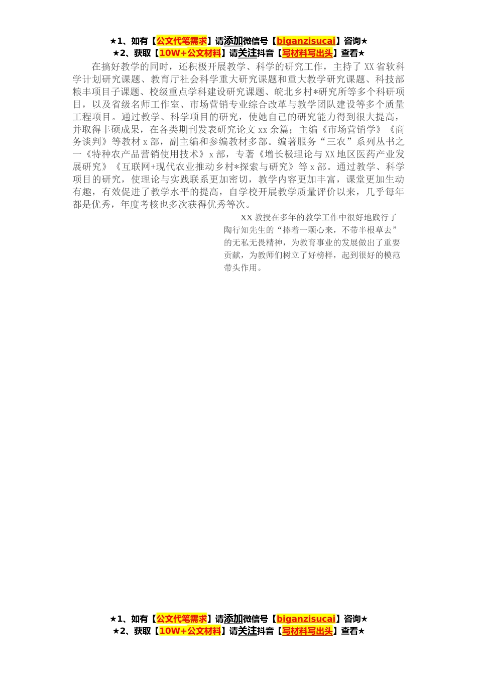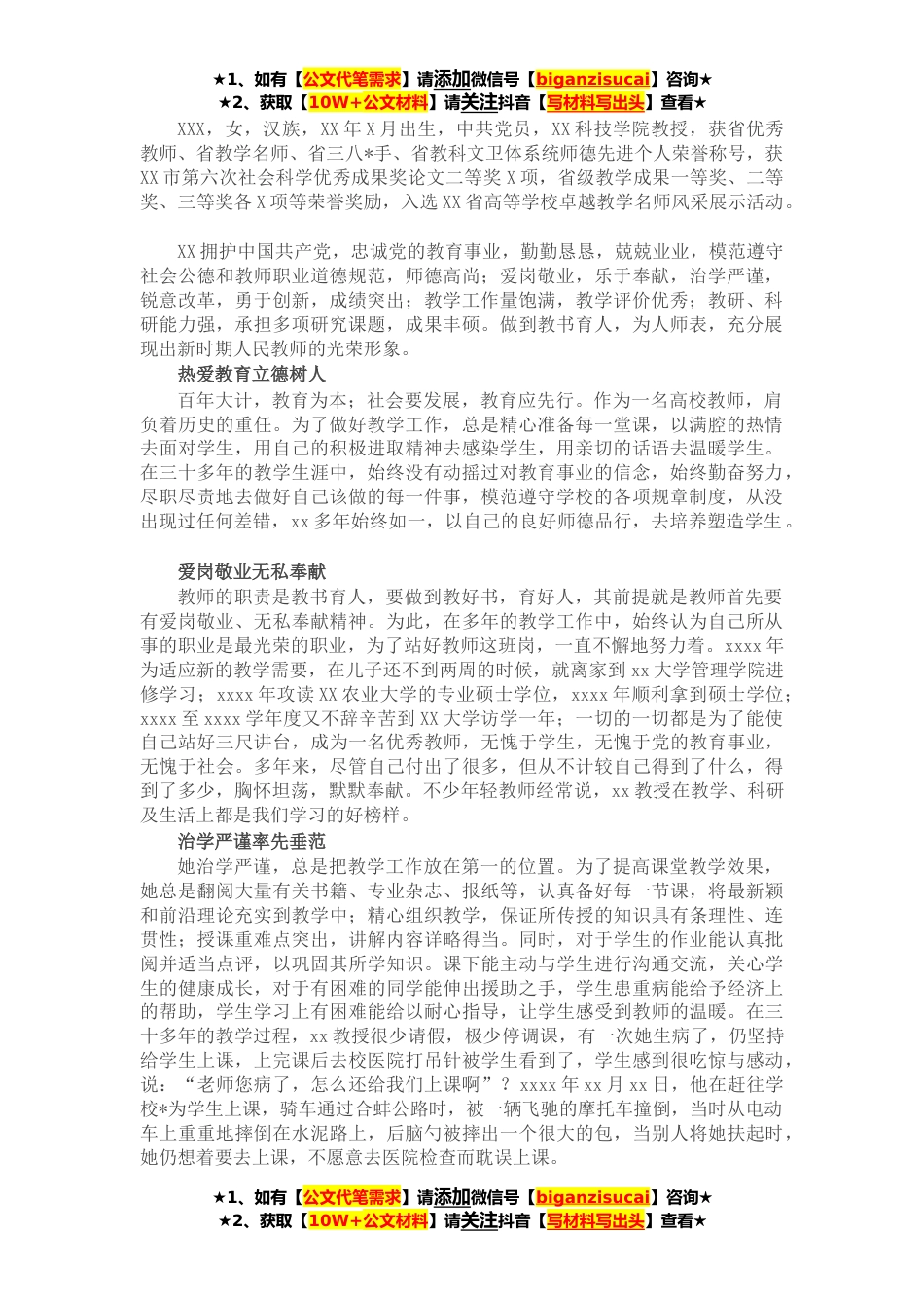 ★1、如有【公文代笔需求】请添加微信号【biganzisucai】咨询★★2、获取【10W+公文材料】请关注抖音【写材料写出头】查看★XXX,女,汉族,XX年X月出生,中共党员,XX科技学院教授,获省优秀教师、省教学名师、省三八*手、省教科文卫体系统师德先进个人荣誉称号,获XX市第六次社会科学优秀成果奖论文二等奖X项,省级教学成果一等奖、二等奖、三等奖各X项等荣誉奖励,入选XX省高等学校卓越教学名师风采展示活动。XX拥护中国共产党,忠诚党的教育事业,勤勤恳恳,兢兢业业,模范遵守社会公德和教师职业道德规范,师德高尚;爱岗敬业,乐于奉献,治学严谨,锐意改革,勇于创新,成绩突出;教学工作量饱满,教学评价优秀;教研、科研能力强,承担多项研究课题,成果丰硕。做到教书育人,为人师表,充分展现出新时期人...