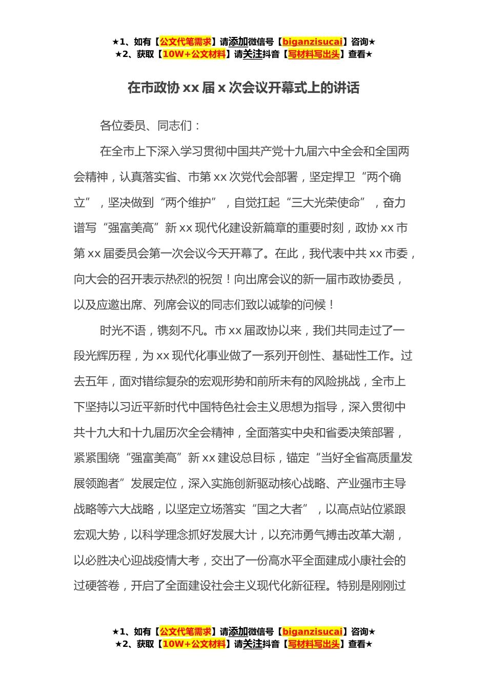 ★1、如有【公文代笔需求】请添加微信号【biganzisucai】咨询★★2、获取【10W+公文材料】请关注抖音【写材料写出头】查看★在市政协xx届x次会议开幕式上的讲话各位委员、同志们:在全市上下深入学习贯彻中国共产党十九届六中全会和全国两会精神,认真落实省、市第xx次党代会部署,坚定捍卫“两个确立”,坚决做到“两个维护”,自觉扛起“三大光荣使命”,奋力谱写“强富美高”新xx现代化建设新篇章的重要时刻,政协xx市第xx届委员会第一次会议今天开幕了。在此,我代表中共xx市委,向大会的召开表示热烈的祝贺!向出席会议的新一届市政协委员,以及应邀出席、列席会议的同志们致以诚挚的问候!时光不语,镌刻不凡。市xx届政协以来,我们共同走过了一段光辉历程,为xx现代化事业做了一系列开创性、基础性工作。过...