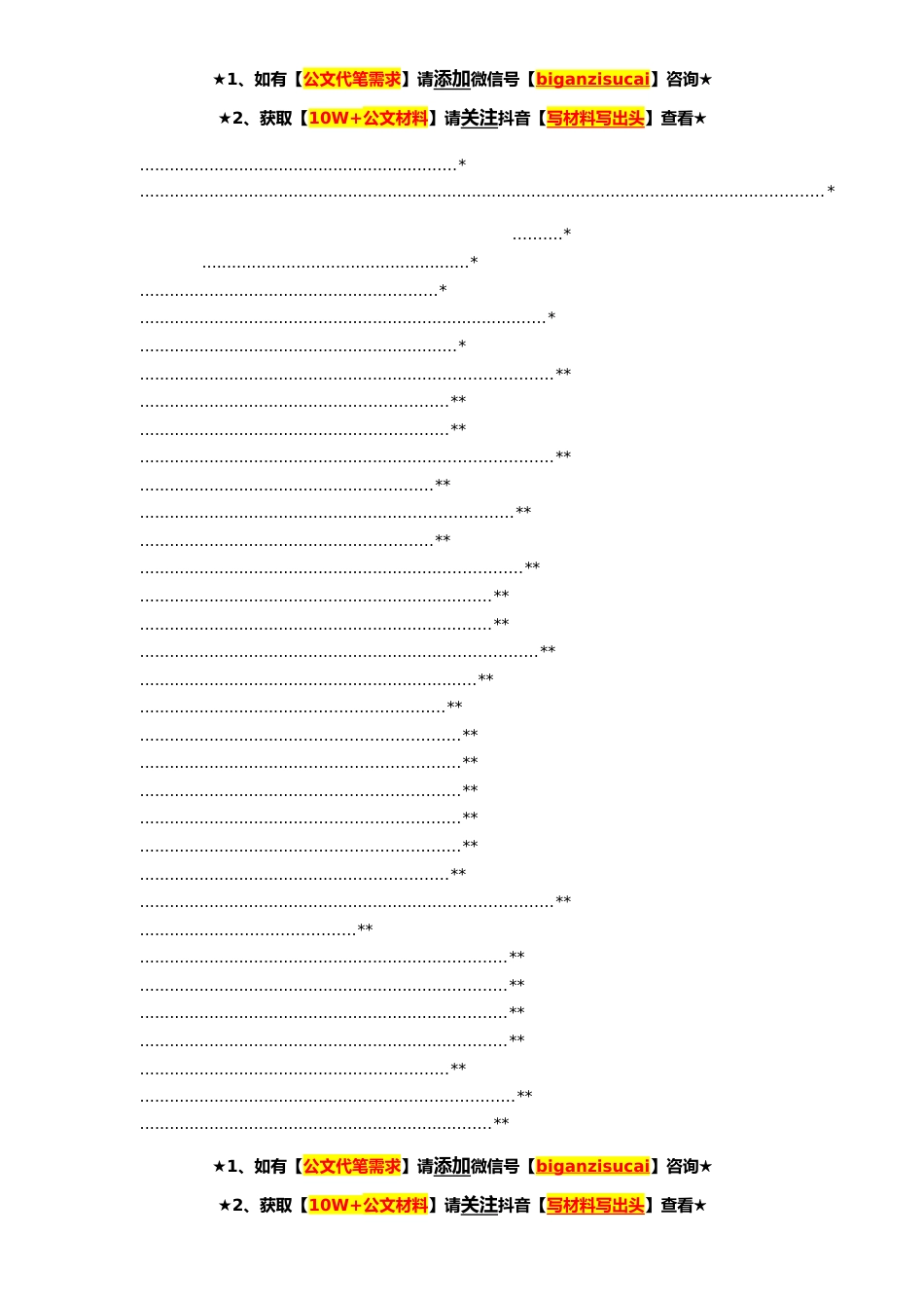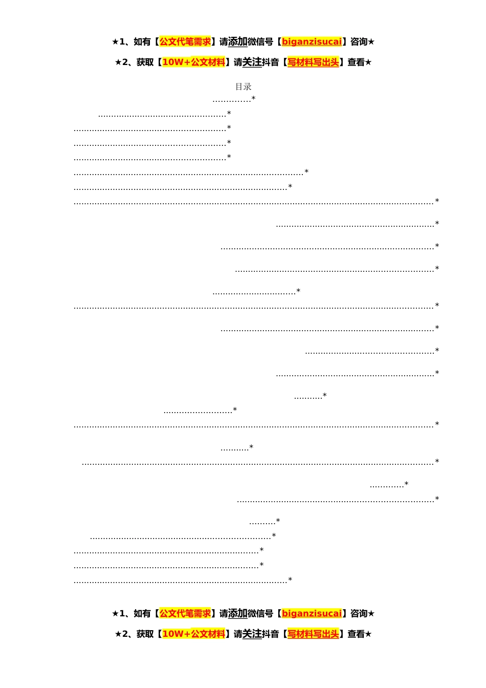 ★1、如有【公文代笔需求】请添加微信号【biganzisucai】咨询★★2、获取【10W+公文材料】请关注抖音【写材料写出头】查看★目录..............*.................................................*..........................................................*..........................................................*..........................................................*........................................................................................*..................................................................................*....................................................................................................................................