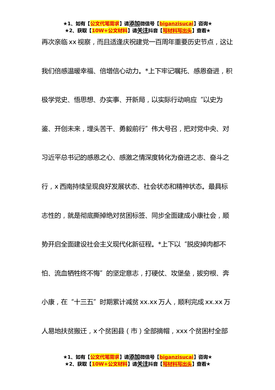 ★1、如有【公文代笔需求】请添加微信号【biganzisucai】咨询★★2、获取【10W+公文材料】请关注抖音【写材料写出头】查看★在政协xx委员会全体会议上的讲话各位委员,同志们:今天,政协第九届xx委员会第一次会议隆重开幕。这是州第八次党代会胜利召开后,*各族人民政治生活中的又一件大事。首先,我代表中共xx委,对大会的召开表示热烈祝贺!向全体政协委员和与*志致以诚挚问候和新春祝福!过去五年,是x西南发展史上极为不易、极不平凡的五年。在州第八次党代会上,我们用“感恩”“决胜”“跨越”“固本”“升级”“增彩”“回报”“行稳”“锤炼”九个关键词进行了全面总结。总的来说,过去五年的工作,千磨万击、艰苦卓绝;过去五年的发展,不负期待、无愧历史;过去五年的历程,精彩纷呈、令人振奋!最具历...