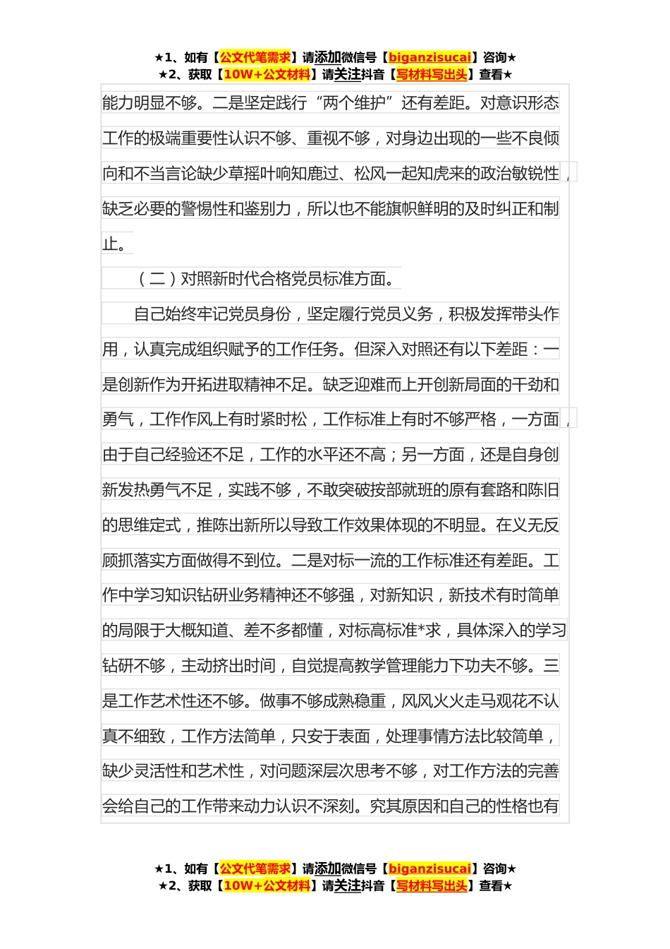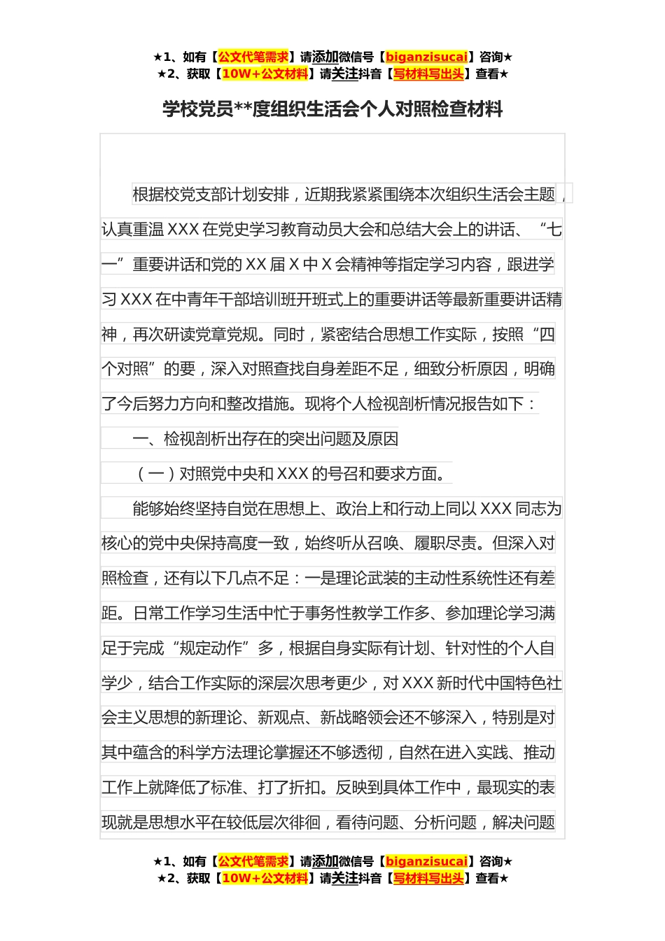 ★1、如有【公文代笔需求】请添加微信号【biganzisucai】咨询★★2、获取【10W+公文材料】请关注抖音【写材料写出头】查看★学校党员**度组织生活会个人对照检查材料根据校党支部计划安排,近期我紧紧围绕本次组织生活会主题,认真重温XXX在党史学习教育动员大会和总结大会上的讲话、“七一”重要讲话和党的XX届X中X会精神等指定学习内容,跟进学习XXX在中青年干部培训班开班式上的重要讲话等最新重要讲话精神,再次研读党章党规。同时,紧密结合思想工作实际,按照“四个对照”的要,深入对照查找自身差距不足,细致分析原因,明确了今后努力方向和整改措施。现将个人检视剖析情况报告如下:一、检视剖析出存在的突出问题及原因(一)对照党中央和XXX的号召和要求方面。能够始终坚持自觉在思想上、政治上和行动上...