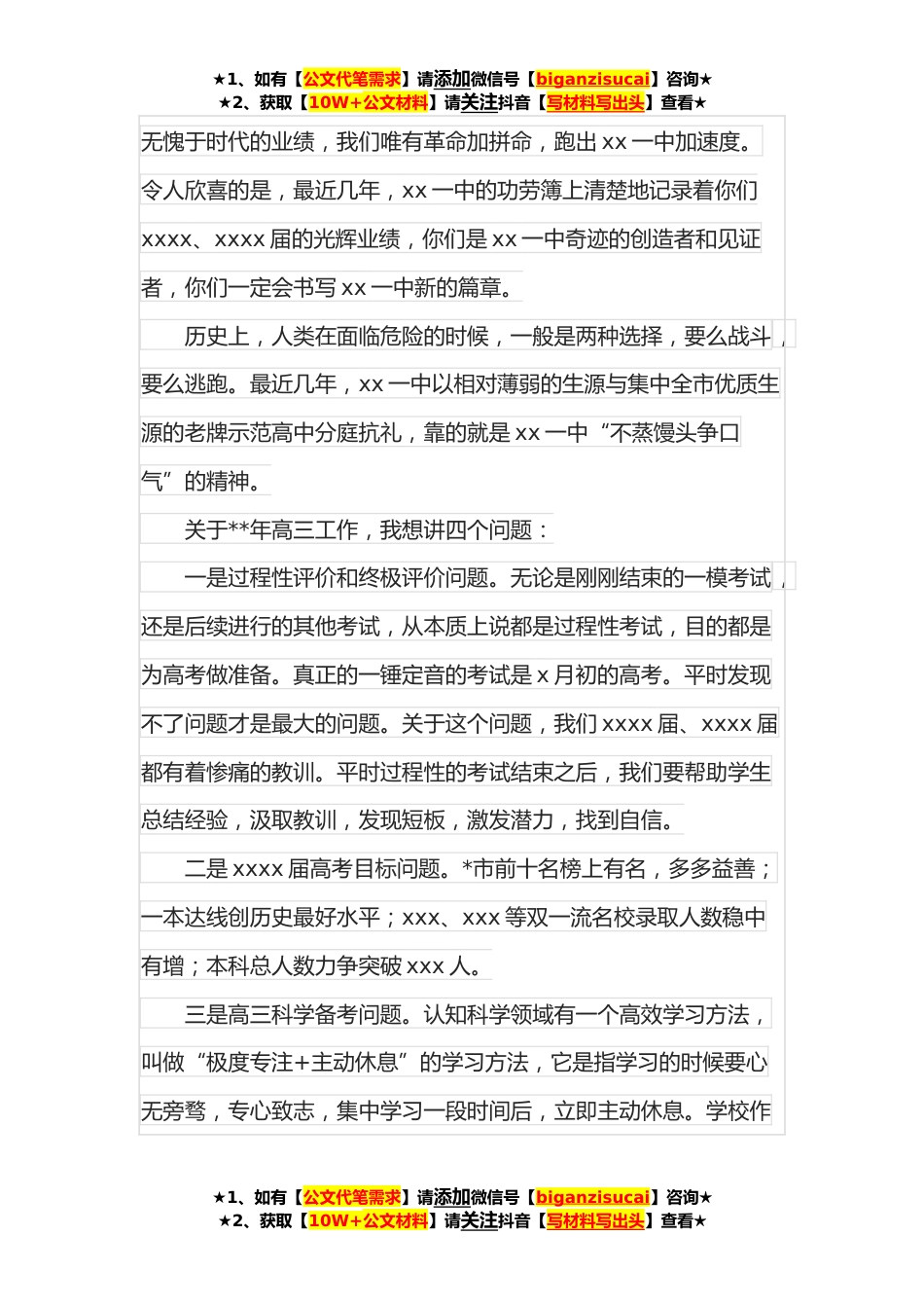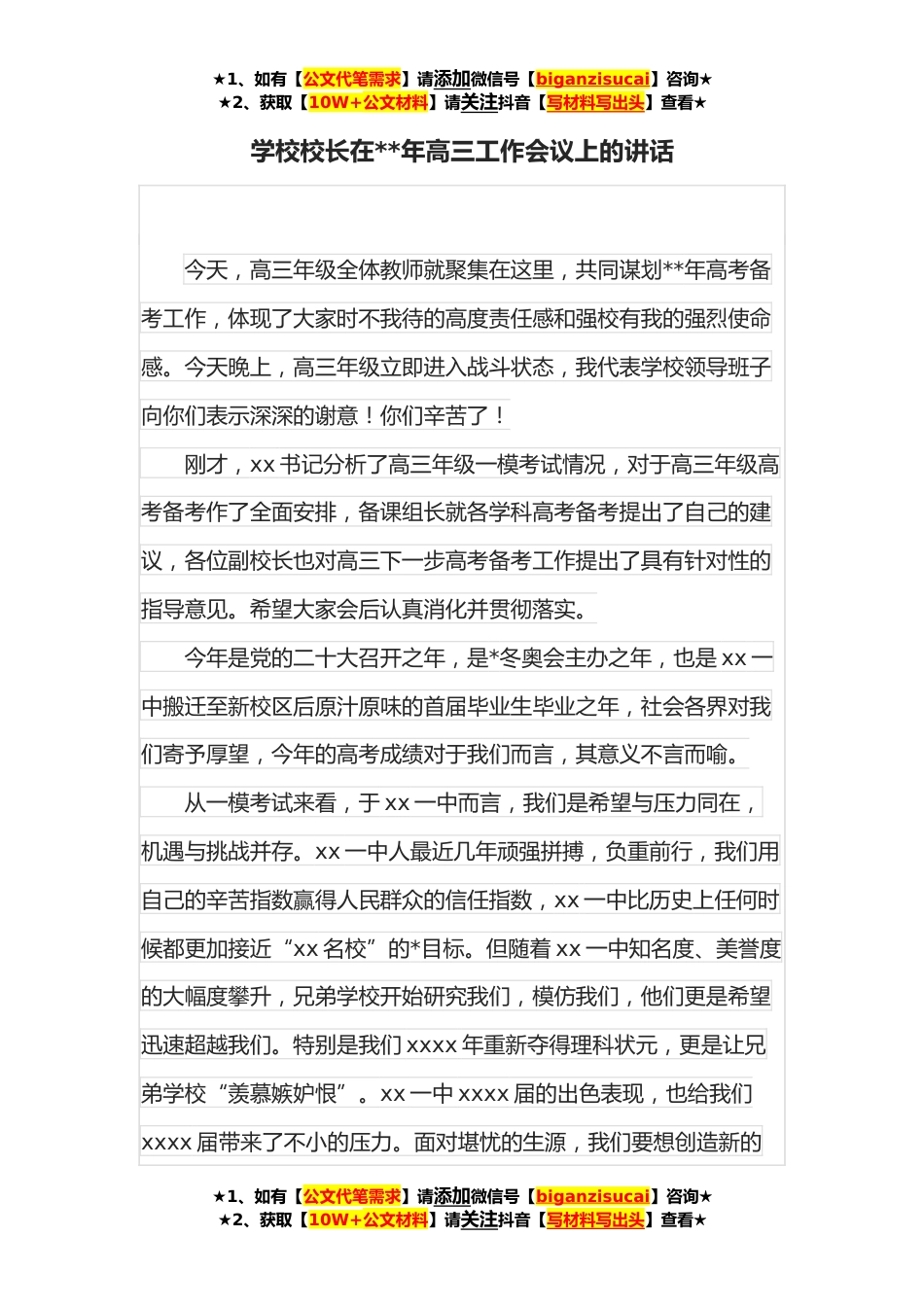 ★1、如有【公文代笔需求】请添加微信号【biganzisucai】咨询★★2、获取【10W+公文材料】请关注抖音【写材料写出头】查看★学校校长在**年高三工作会议上的讲话今天,高三年级全体教师就聚集在这里,共同谋划**年高考备考工作,体现了大家时不我待的高度责任感和强校有我的强烈使命感。今天晚上,高三年级立即进入战斗状态,我代表学校领导班子向你们表示深深的谢意!你们辛苦了!刚才,xx书记分析了高三年级一模考试情况,对于高三年级高考备考作了全面安排,备课组长就各学科高考备考提出了自己的建议,各位副校长也对高三下一步高考备考工作提出了具有针对性的指导意见。希望大家会后认真消化并贯彻落实。今年是党的二十大召开之年,是*冬奥会主办之年,也是xx一中搬迁至新校区后原汁原味的首届毕业生毕业之年...