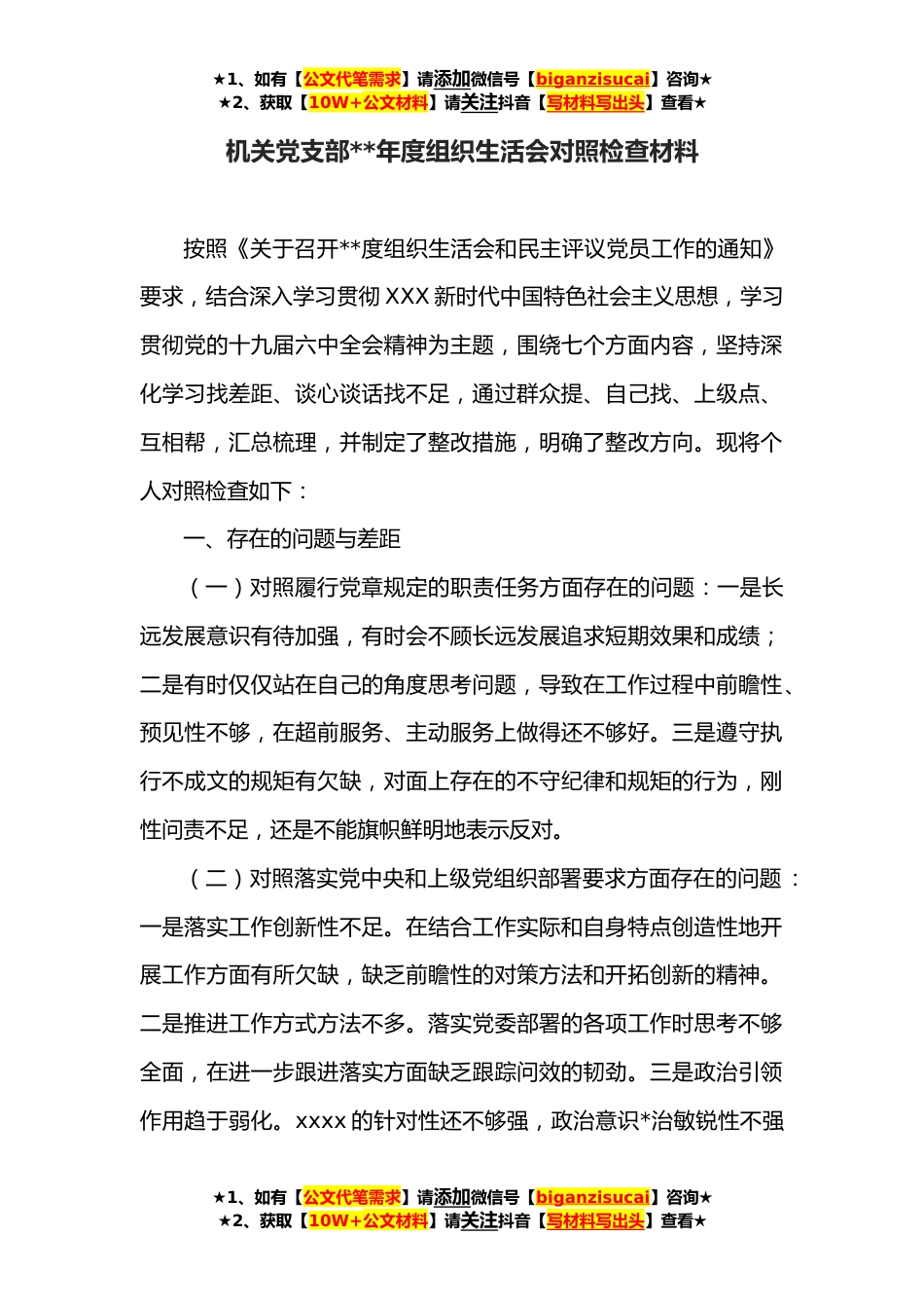 ★1、如有【公文代笔需求】请添加微信号【biganzisucai】咨询★★2、获取【10W+公文材料】请关注抖音【写材料写出头】查看★机关党支部**年度组织生活会对照检查材料按照《关于召开**度组织生活会和民主评议党员工作的通知》要求,结合深入学习贯彻XXX新时代中国特色社会主义思想,学习贯彻党的十九届六中全会精神为主题,围绕七个方面内容,坚持深化学习找差距、谈心谈话找不足,通过群众提、自己找、上级点、互相帮,汇总梳理,并制定了整改措施,明确了整改方向。现将个人对照检查如下:一、存在的问题与差距(一)对照履行党章规定的职责任务方面存在的问题:一是长远发展意识有待加强,有时会不顾长远发展追求短期效果和成绩;二是有时仅仅站在自己的角度思考问题,导致在工作过程中前瞻性、预见性不够,在超...