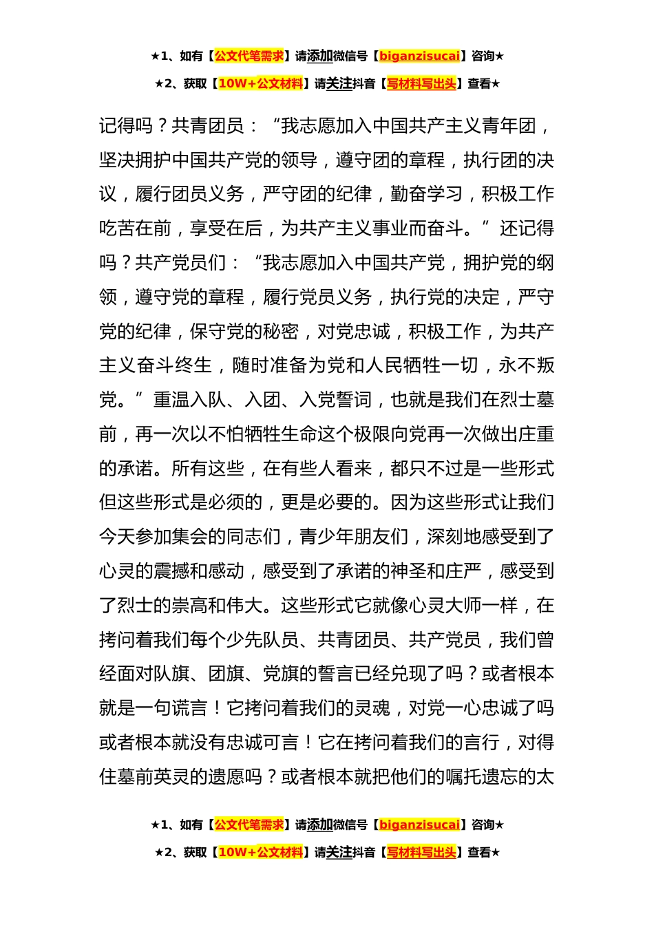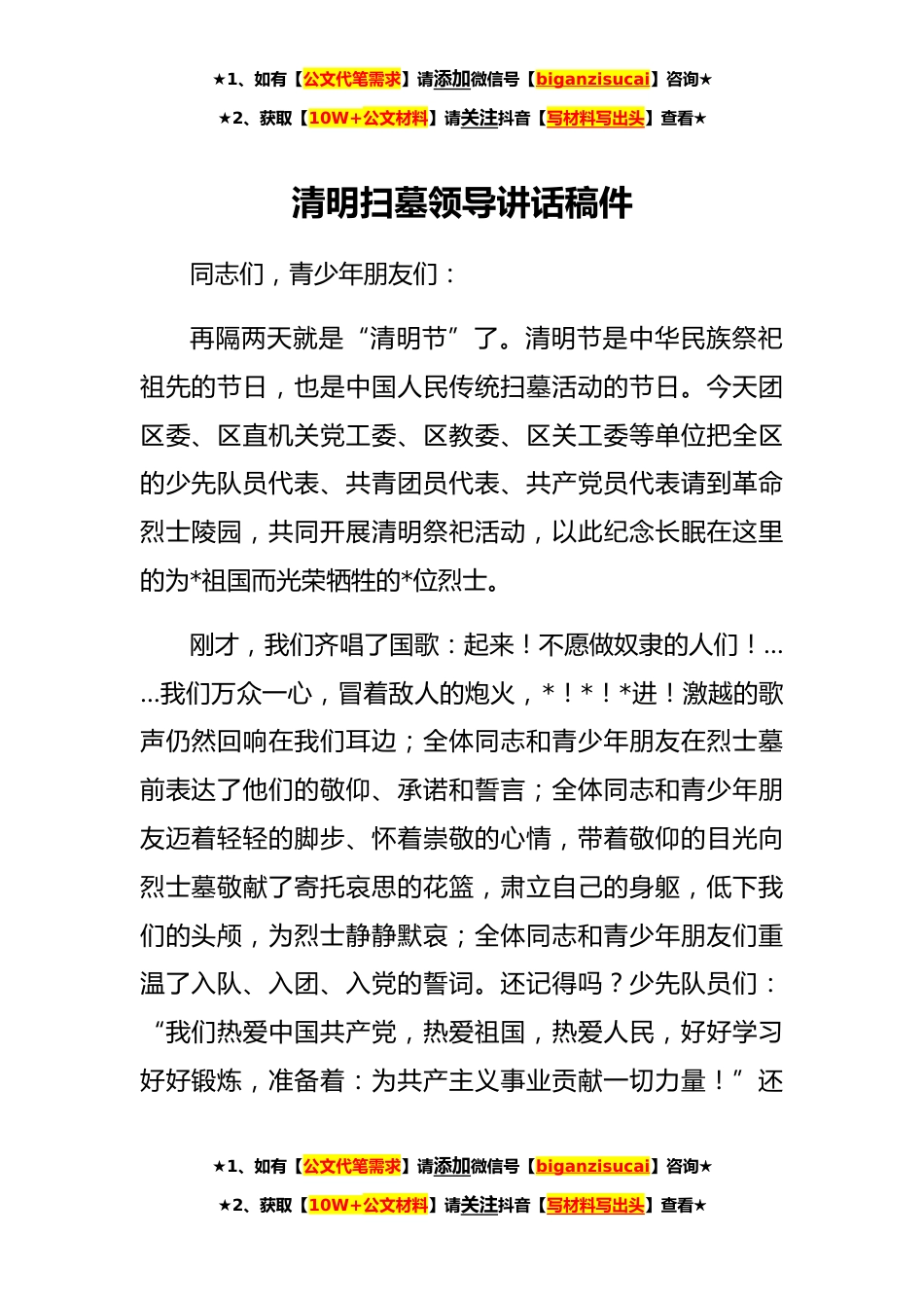 ★1、如有【公文代笔需求】请添加微信号【biganzisucai】咨询★★2、获取【10W+公文材料】请关注抖音【写材料写出头】查看★清明扫墓领导讲话稿件同志们,青少年朋友们:再隔两天就是“清明节”了。清明节是中华民族祭祀祖先的节日,也是中国人民传统扫墓活动的节日。今天团区委、区直机关党工委、区教委、区关工委等单位把全区的少先队员代表、共青团员代表、共产党员代表请到革命烈士陵园,共同开展清明祭祀活动,以此纪念长眠在这里的为*祖国而光荣牺牲的*位烈士。刚才,我们齐唱了国歌:起来!不愿做奴隶的人们!……我们万众一心,冒着敌人的炮火,*!*!*进!激越的歌声仍然回响在我们耳边;全体同志和青少年朋友在烈士墓前表达了他们的敬仰、承诺和誓言;全体同志和青少年朋友迈着轻轻的脚步、怀着崇敬的心...
