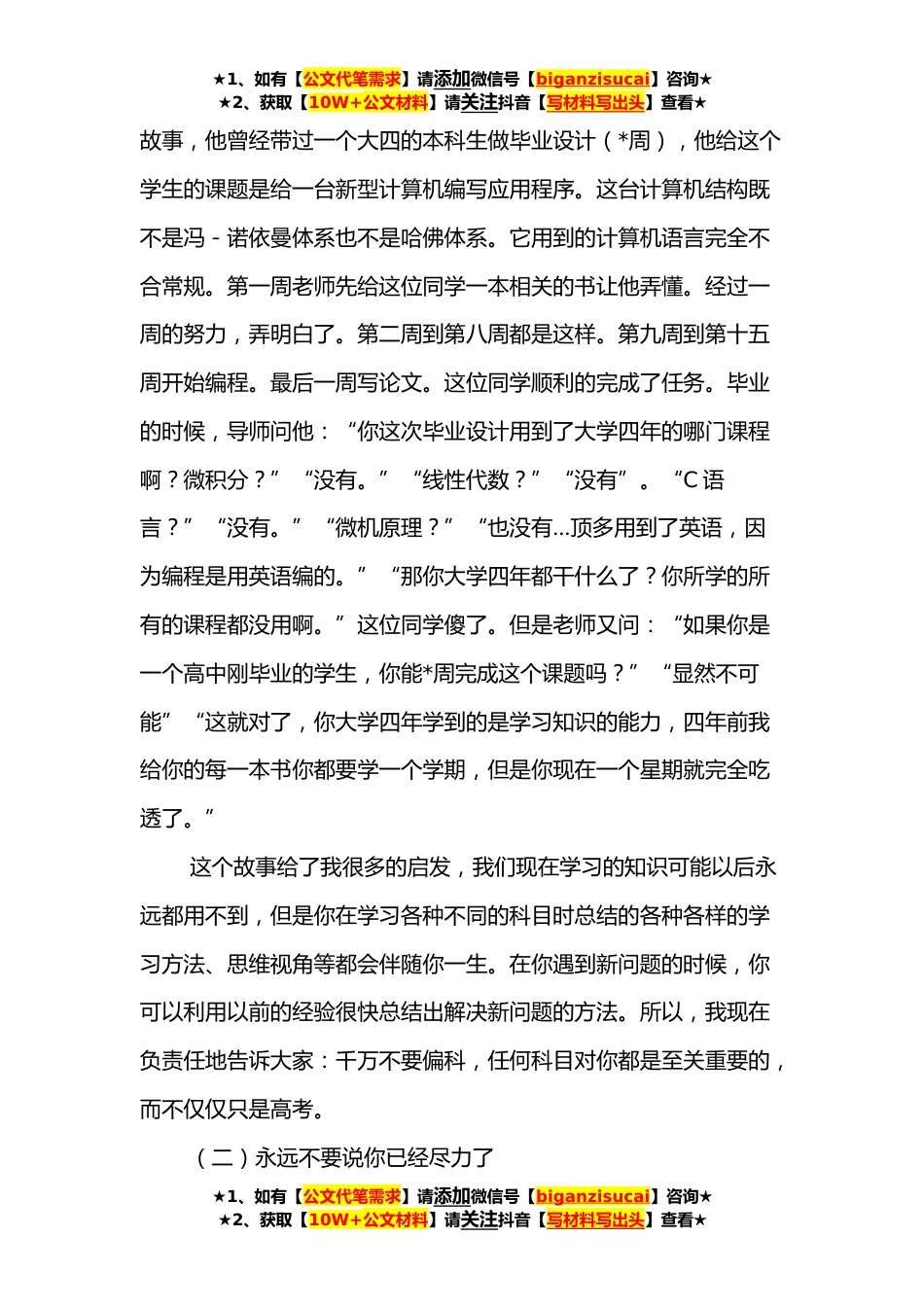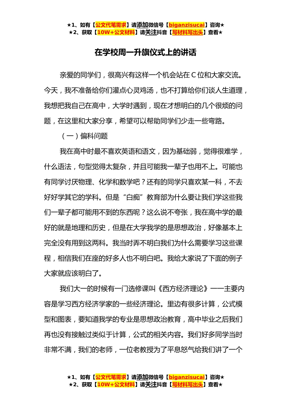 ★1、如有【公文代笔需求】请添加微信号【biganzisucai】咨询★★2、获取【10W+公文材料】请关注抖音【写材料写出头】查看★在学校周一升旗仪式上的讲话亲爱的同学们,很高兴有这样一个机会站在C位和大家交流。今天,我不准备给你们灌点心灵鸡汤,也不打算给你们谈人生道理,我想把我自己在高中,大学时遇到,现在才想明白的几个很烦的问题,在这里和大家分享,希望可以帮助同学们少走一些弯路。(一)偏科问题我在高中时最不喜欢英语和语文,因为基础弱,觉得很难学,什么语法,句型觉得太复杂,并且可能我一辈子也用不上。可能也有同学讨厌物理、化学和数学吧?还有的同学只喜欢某一科,不去好好学其它的学科。但是“白痴”教育部为什么要让我们学这些我们一辈子都可能用不到的东西呢?这么说不夸张,我在高中学...