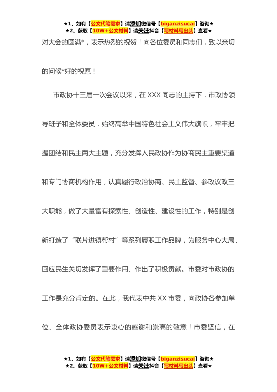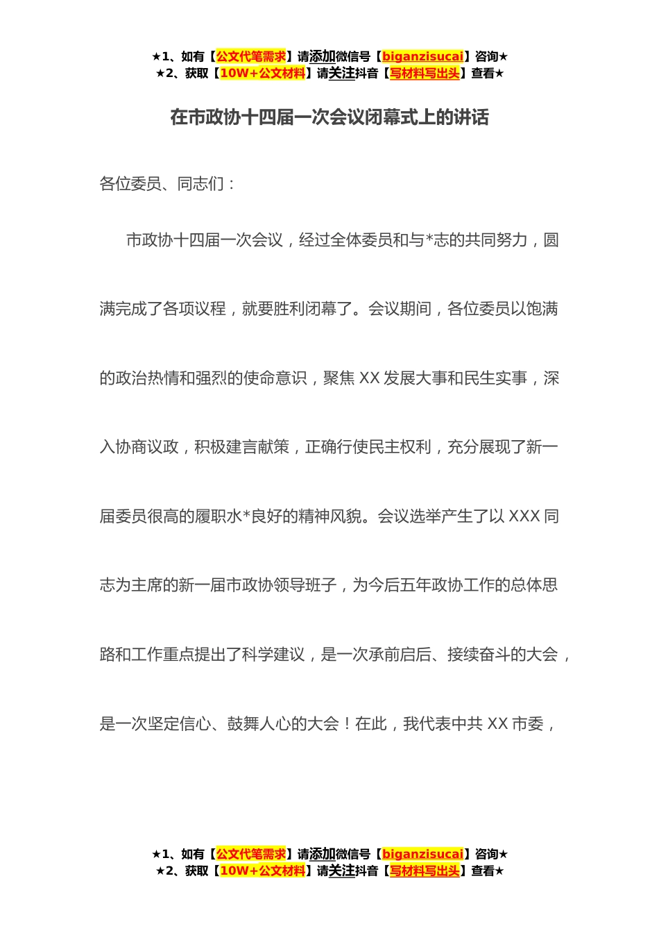 ★1、如有【公文代笔需求】请添加微信号【biganzisucai】咨询★★2、获取【10W+公文材料】请关注抖音【写材料写出头】查看★在市政协十四届一次会议闭幕式上的讲话各位委员、同志们:市政协十四届一次会议,经过全体委员和与*志的共同努力,圆满完成了各项议程,就要胜利闭幕了。会议期间,各位委员以饱满的政治热情和强烈的使命意识,聚焦XX发展大事和民生实事,深入协商议政,积极建言献策,正确行使民主权利,充分展现了新一届委员很高的履职水*良好的精神风貌。会议选举产生了以XXX同志为主席的新一届市政协领导班子,为今后五年政协工作的总体思路和工作重点提出了科学建议,是一次承前启后、接续奋斗的大会,是一次坚定信心、鼓舞人心的大会!在此,我代表中共XX市委,★1、如有【公文代笔需求】请添加微信...
