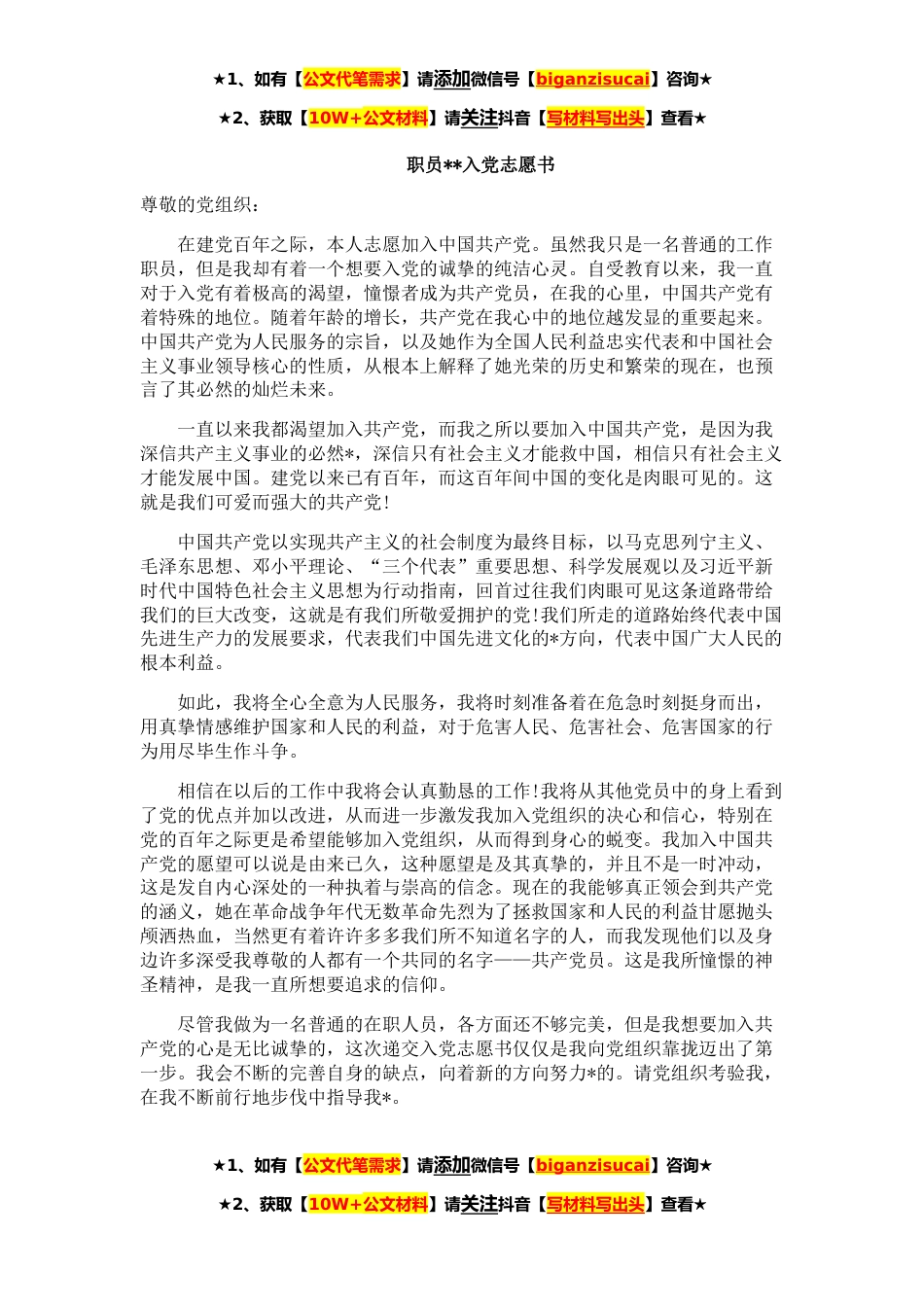 ★1、如有【公文代笔需求】请添加微信号【biganzisucai】咨询★★2、获取【10W+公文材料】请关注抖音【写材料写出头】查看★职员**入党志愿书尊敬的党组织:在建党百年之际,本人志愿加入中国共产党。虽然我只是一名普通的工作职员,但是我却有着一个想要入党的诚挚的纯洁心灵。自受教育以来,我一直对于入党有着极高的渴望,憧憬者成为共产党员,在我的心里,中国共产党有着特殊的地位。随着年龄的增长,共产党在我心中的地位越发显的重要起来。中国共产党为人民服务的宗旨,以及她作为全国人民利益忠实代表和中国社会主义事业领导核心的性质,从根本上解释了她光荣的历史和繁荣的现在,也预言了其必然的灿烂未来。一直以来我都渴望加入共产党,而我之所以要加入中国共产党,是因为我深信共产主义事业的必然*,深...