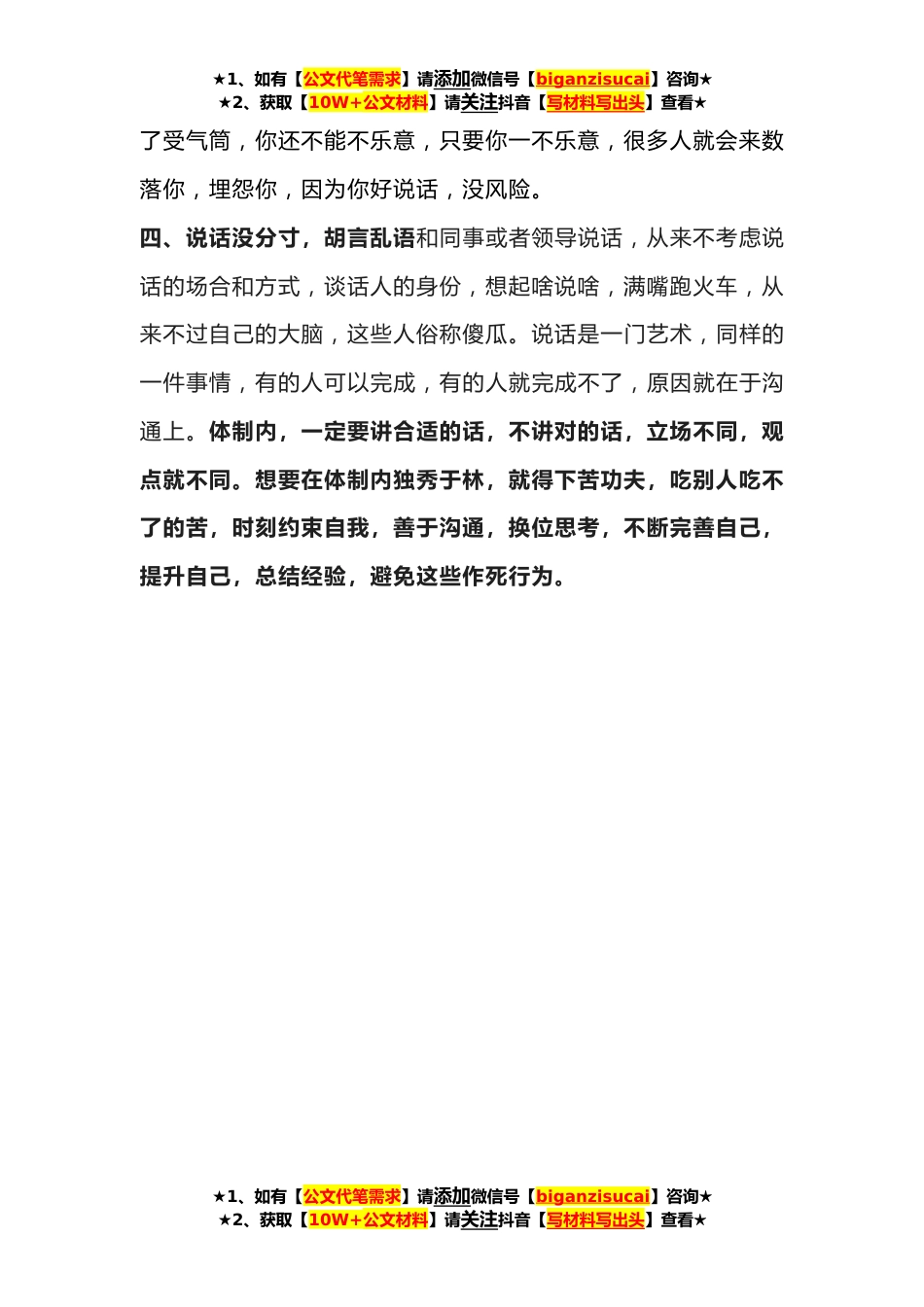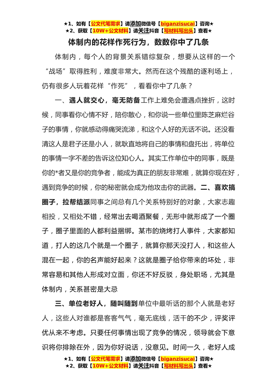 ★1、如有【公文代笔需求】请添加微信号【biganzisucai】咨询★★2、获取【10W+公文材料】请关注抖音【写材料写出头】查看★体制内的花样作死行为,数数你中了几条体制内,每个人的背景关系错综复杂,想要从这样的一个“战场”取得胜利,难度非常大。然而在这个残酷的逐利场上,仍有很多人玩着花样“作死”,看看你中了几条?一、遇人就交心,毫无防备工作上难免会遭遇点挫折,这时候,同事看你心情不好,陪你散心,和你说一些单位里陈芝麻烂谷子的事情,你就感动得痛哭流涕,和这个人好的无话不说。还没看清这人是君子还是小人,就耿直地将自己的事情和盘托出,将单位的事情一字不差的告诉这位知心人。其实工作单位中的同事,既是你的*者又是你的竞争者,能成为真正的朋友非常难,就算你现在好,遇到竞争的时候,...