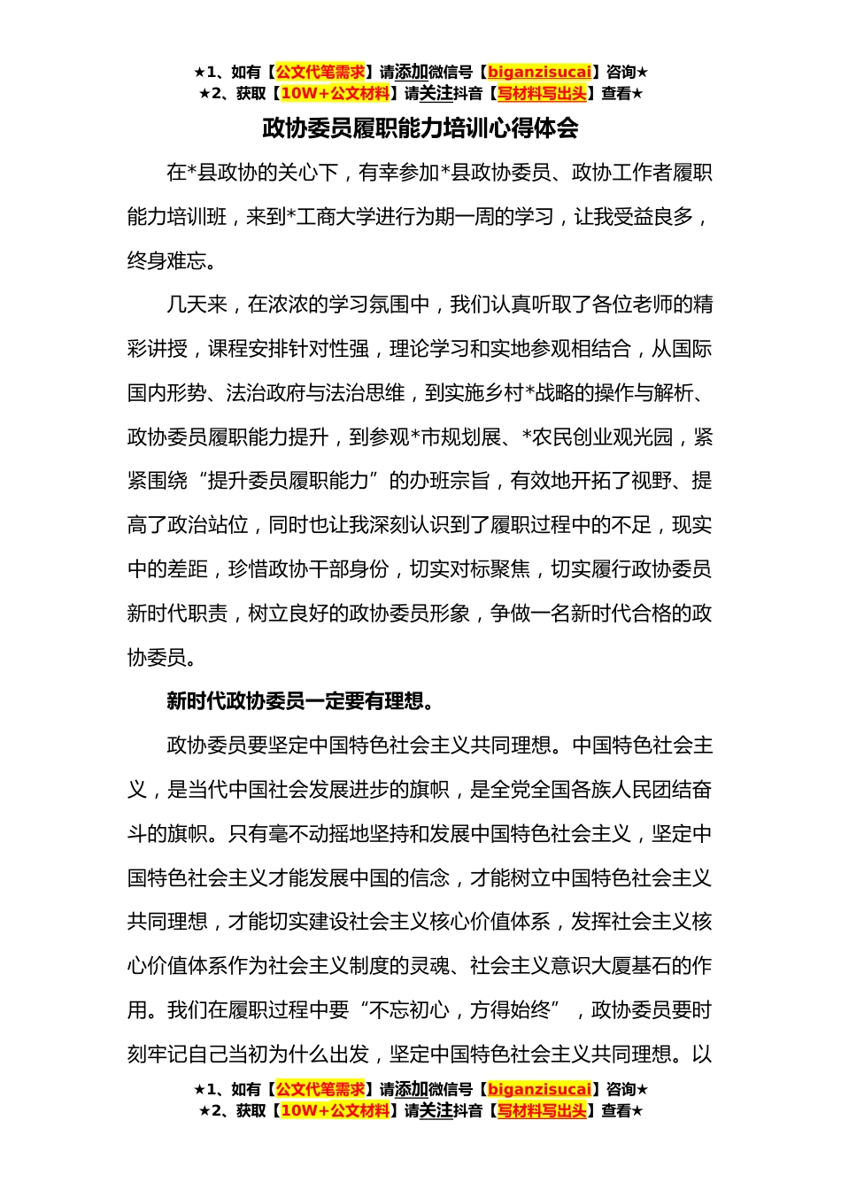 ★1、如有【公文代笔需求】请添加微信号【biganzisucai】咨询★★2、获取【10W+公文材料】请关注抖音【写材料写出头】查看★政协委员履职能力培训心得体会在*县政协的关心下,有幸参加*县政协委员、政协工作者履职能力培训班,来到*工商大学进行为期一周的学习,让我受益良多,终身难忘。几天来,在浓浓的学习氛围中,我们认真听取了各位老师的精彩讲授,课程安排针对性强,理论学习和实地参观相结合,从国际国内形势、法治政府与法治思维,到实施乡村*战略的操作与解析、政协委员履职能力提升,到参观*市规划展、*农民创业观光园,紧紧围绕“提升委员履职能力”的办班宗旨,有效地开拓了视野、提高了政治站位,同时也让我深刻认识到了履职过程中的不足,现实中的差距,珍惜政协干部身份,切实对标聚焦,切实履行...