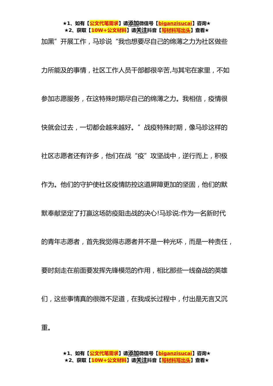 ★1、如有【公文代笔需求】请添加微信号【biganzisucai】咨询★★2、获取【10W+公文材料】请关注抖音【写材料写出头】查看★分管领导个人先进事迹材料(*)分管领导个人先进事迹材料*面对这场突如其来的新冠肺炎疫情,社区作为抗击疫情的第一线,筑起了抗击疫情的第一道防御墙。“我是志愿者,奔赴疫情防控一线责无旁贷”作为广场社区的志愿者马珍,第一时间报道,主动加入到社区防疫工作队*。马珍是一名开饰品店的店主,平日里也是个热心人,在社区有需要的时候她总是第一个来帮忙。疫情防控期间,她负责在社区电话摸排每家每户的信息,然后又在小区院内挨家挨户进行登记排查、到各小区张贴公告、发放出入证、对重点人员进行管理服务等工作,防疫任务多、责任重,她每天跟许多社区干部一样,坚持“五加二”、“白★...