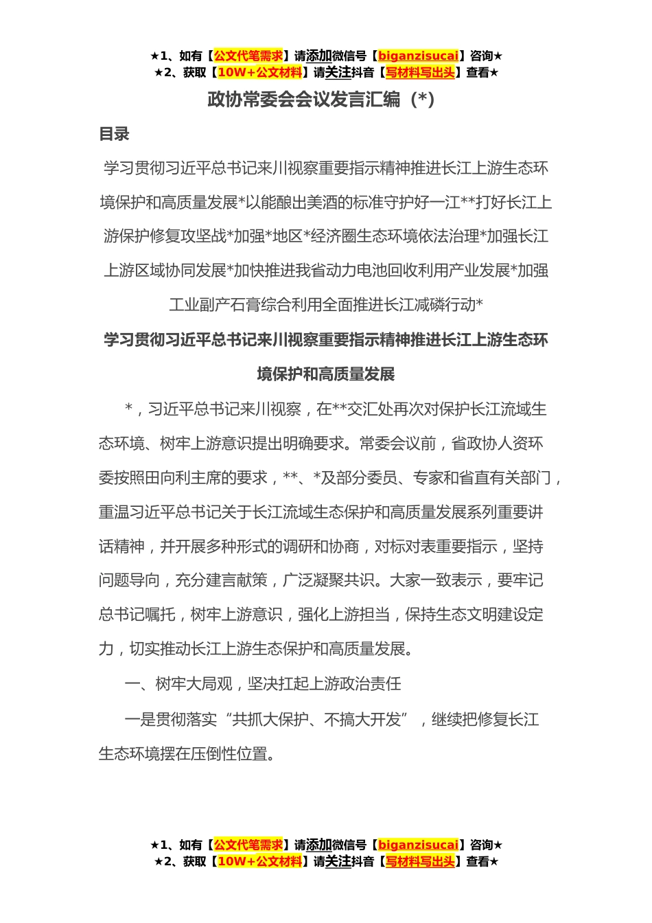 ★1、如有【公文代笔需求】请添加微信号【biganzisucai】咨询★★2、获取【10W+公文材料】请关注抖音【写材料写出头】查看★政协常委会会议发言汇编(*)目录学习贯彻习近平总书记来川视察重要指示精神推进长江上游生态环境保护和高质量发展*以能酿出美酒的标准守护好一江**打好长江上游保护修复攻坚战*加强*地区*经济圈生态环境依法治理*加强长江上游区域协同发展*加快推进我省动力电池回收利用产业发展*加强工业副产石膏综合利用全面推进长江减磷行动*学习贯彻习近平总书记来川视察重要指示精神推进长江上游生态环境保护和高质量发展*,习近平总书记来川视察,在**交汇处再次对保护长江流域生态环境、树牢上游意识提出明确要求。常委会议前,省政协人资环委按照田向利主席的要求,**、*及部分委员、专家和省直有...