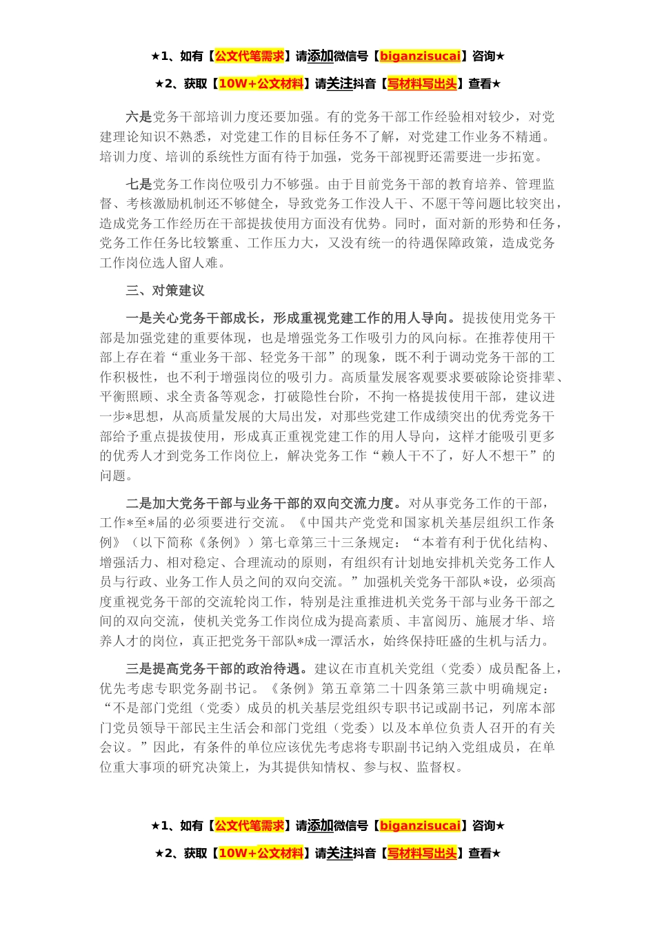 ★1、如有【公文代笔需求】请添加微信号【biganzisucai】咨询★★2、获取【10W+公文材料】请关注抖音【写材料写出头】查看★在当前开展的“思想再*、笃行新发展理念,推动高质量发展”工作中,如何进一步调动和发挥党务工作者的积极性、主动性、创造性,发挥广大党务工作者的积极作用,市委直属机关工委组织开展了专题调研。一、基本情况市委直属机关工委下辖*个党组织,党员*人,专兼职党务干部*人,其中:专职党务干部*人,兼职党务干部*人。*名党务干部中*岁以下的*名;*—*岁的*名;*—*岁的*名。研究生以上学历的*名,大学本科*名,大学专科*名,高中*名。从事党务工作时间不满*年的*名,*—*年的*名,*—*年的*名,*年以上的*名。二、存在的问题此次调研主要采取走访、座谈和调查问卷的形式进行,来自市直机...