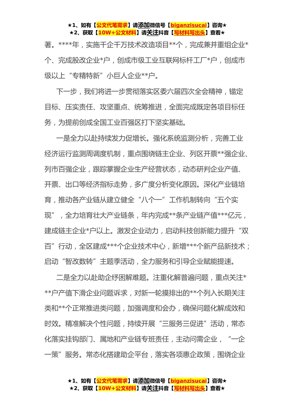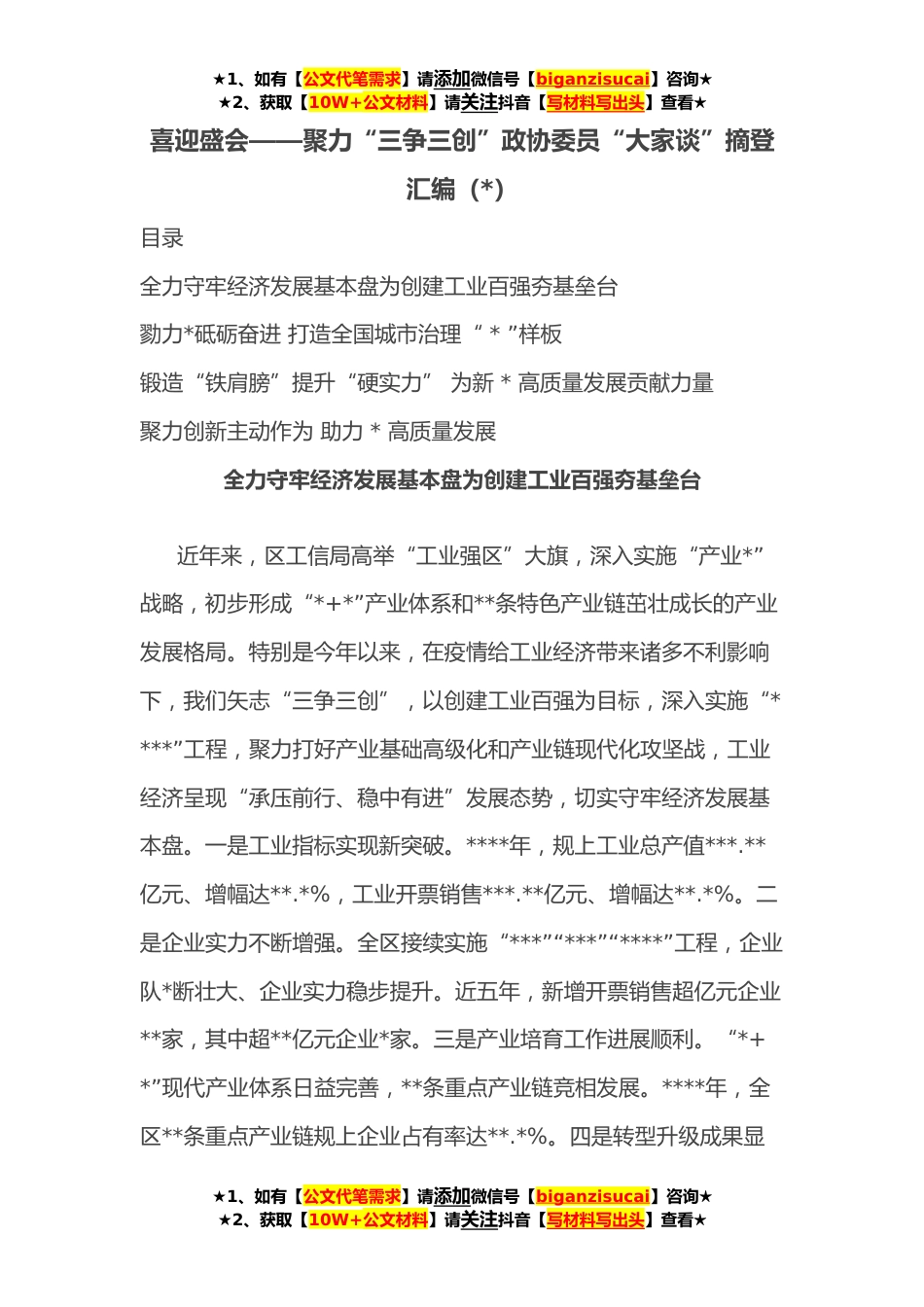 ★1、如有【公文代笔需求】请添加微信号【biganzisucai】咨询★★2、获取【10W+公文材料】请关注抖音【写材料写出头】查看★喜迎盛会——聚力“三争三创”政协委员“大家谈”摘登汇编(*)目录全力守牢经济发展基本盘为创建工业百强夯基垒台勠力*砥砺奋进打造全国城市治理“*”样板‍'锻造“铁肩膀”提升“硬实力”为新*高质量发展贡献力量聚力创新主动作为助力*高质量发展全力守牢经济发展基本盘为创建工业百强夯基垒台近年来,区工信局高举“工业强区”大旗,深入实施“产业*”战略,初步形成“*+*”产业体系和**条特色产业链茁壮成长的产业发展格局。特别是今年以来,在疫情给工业经济带来诸多不利影响下,我们矢志“三争三创”,以创建工业百强为目标,深入实施“****”工程,聚力打好产业基础高级化和产业链...
