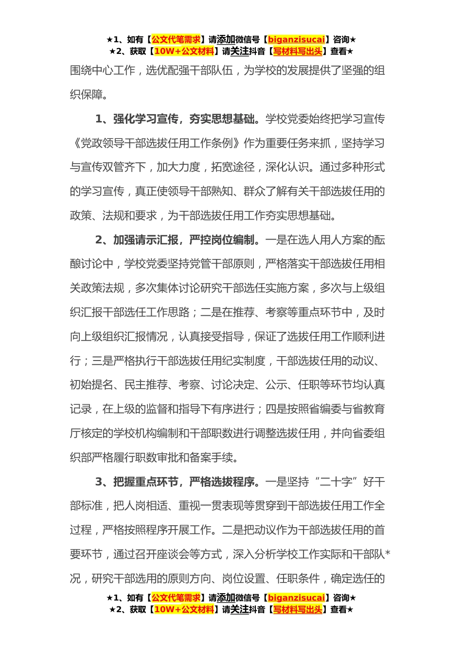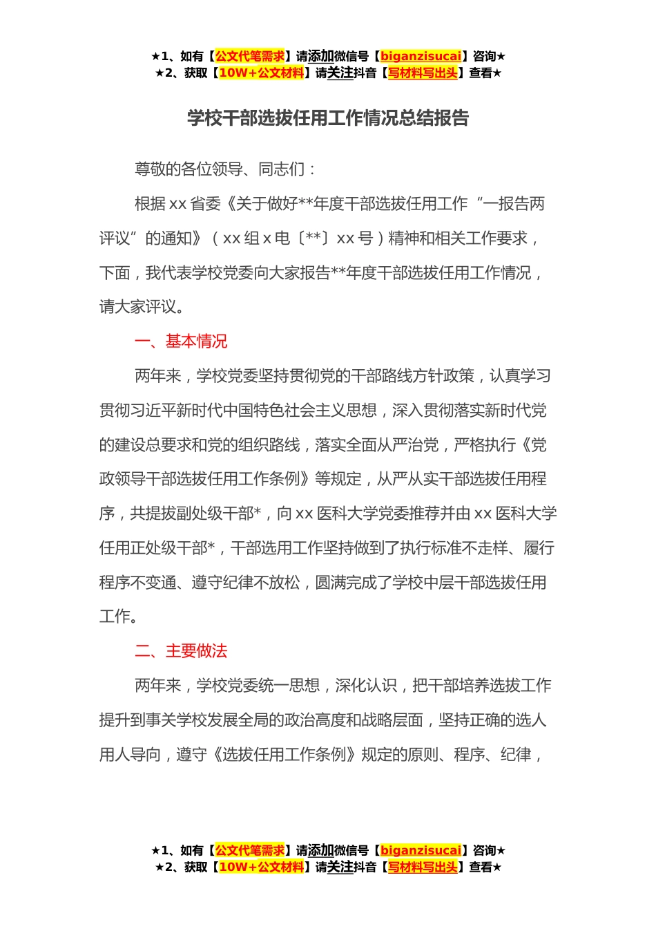 ★1、如有【公文代笔需求】请添加微信号【biganzisucai】咨询★★2、获取【10W+公文材料】请关注抖音【写材料写出头】查看★学校干部选拔任用工作情况总结报告尊敬的各位领导、同志们:根据xx省委《关于做好**年度干部选拔任用工作“一报告两评议”的通知》(xx组x电〔**〕xx号)精神和相关工作要求,下面,我代表学校党委向大家报告**年度干部选拔任用工作情况,请大家评议。一、基本情况两年来,学校党委坚持贯彻党的干部路线方针政策,认真学习贯彻习近平新时代中国特色社会主义思想,深入贯彻落实新时代党的建设总要求和党的组织路线,落实全面从严治党,严格执行《党政领导干部选拔任用工作条例》等规定,从严从实干部选拔任用程序,共提拔副处级干部*,向xx医科大学党委推荐并由xx医科大学任用正处级干部*,...