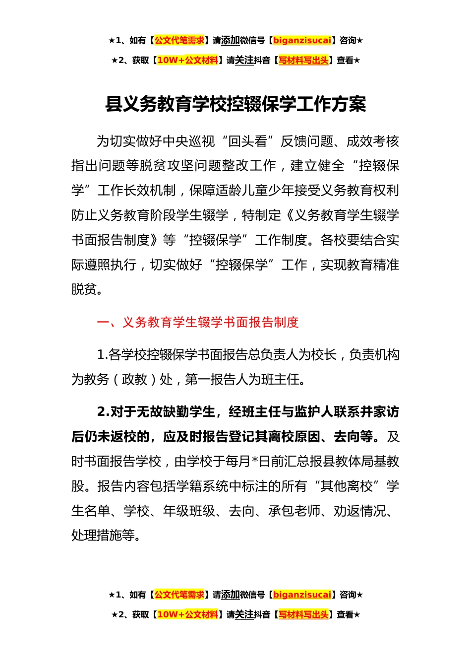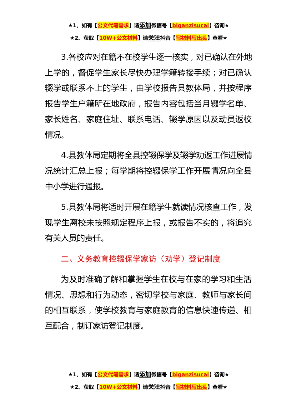 ★1、如有【公文代笔需求】请添加微信号【biganzisucai】咨询★★2、获取【10W+公文材料】请关注抖音【写材料写出头】查看★县义务教育学校控辍保学工作方案为切实做好中央巡视“回头看”反馈问题、成效考核指出问题等脱贫攻坚问题整改工作,建立健全“控辍保学”工作长效机制,保障适龄儿童少年接受义务教育权利防止义务教育阶段学生辍学,特制定《义务教育学生辍学书面报告制度》等“控辍保学”工作制度。各校要结合实际遵照执行,切实做好“控辍保学”工作,实现教育精准脱贫。一、义务教育学生辍学书面报告制度1.各学校控辍保学书面报告总负责人为校长,负责机构为教务(政教)处,第一报告人为班主任。2.对于无故缺勤学生,经班主任与监护人联系并家访后仍未返校的,应及时报告登记其离校原因、去向等。及时...
