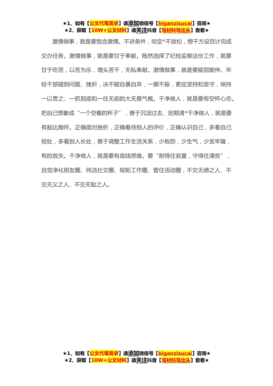 ★1、如有【公文代笔需求】请添加微信号【biganzisucai】咨询★★2、获取【10W+公文材料】请关注抖音【写材料写出头】查看★在纪检监察干部座谈会上的发言今天我围绕“奋斗的青春更美丽”来总结过去、检视现在、展望未来,同时也警醒自己、鞭策自己。一、年轻干部既要仰望星空,又要脚踏实地仰望星空,就是要坚定理想信念。坚定理想信念是终身“必修课”。回顾自己走过的路,我深刻体会到,年轻干部普遍存在历练不足、定力不够等问题,偶尔会产生“英雄无用武之地”的想法,只有不断坚定理想信念,才能站位更高,心胸更开阔,做到“不畏浮云遮望眼”“乱云飞渡仍从容”。脚踏实地,就是要一步一个脚印。“天下难事,必作于易;天下大事,必作于细”。年轻干部有理想信念,但有时候会急于求成,需要“沉下心来”。...
