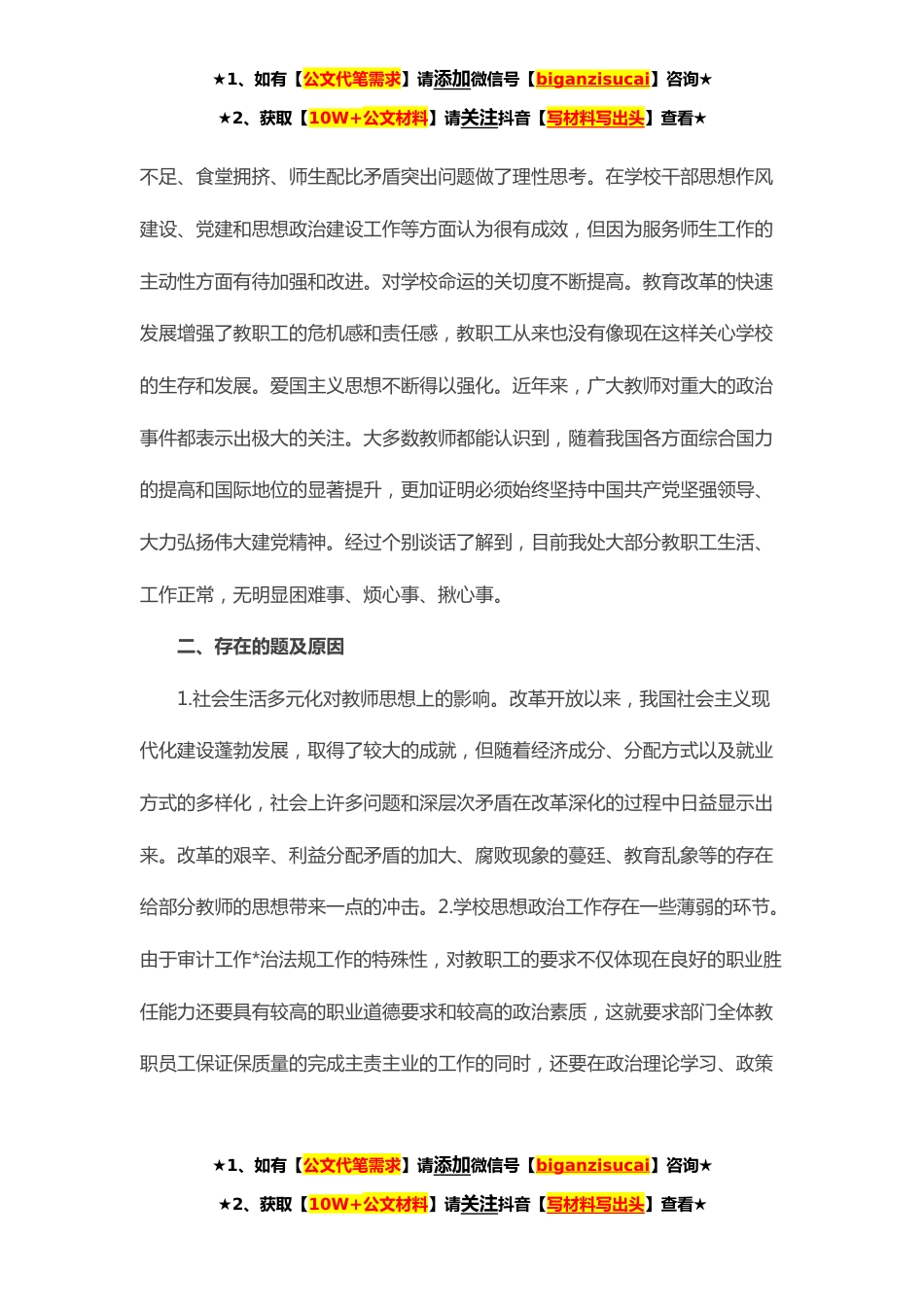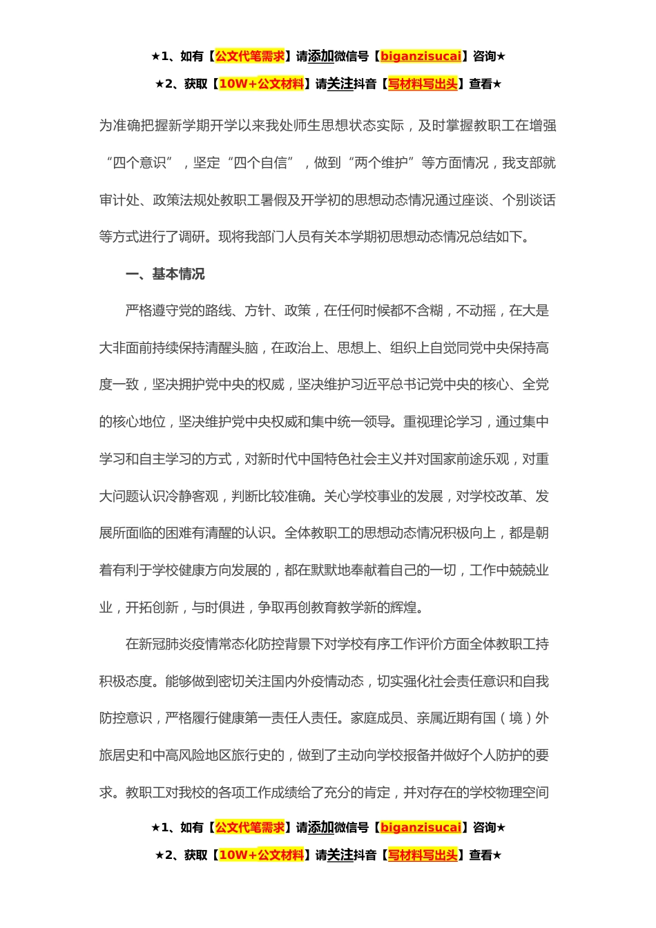 ★1、如有【公文代笔需求】请添加微信号【biganzisucai】咨询★★2、获取【10W+公文材料】请关注抖音【写材料写出头】查看★为准确把握新学期开学以来我处师生思想状态实际,及时掌握教职工在增强“四个意识”,坚定“四个自信”,做到“两个维护”等方面情况,我支部就审计处、政策法规处教职工暑假及开学初的思想动态情况通过座谈、个别谈话等方式进行了调研。现将我部门人员有关本学期初思想动态情况总结如下。一、基本情况严格遵守党的路线、方针、政策,在任何时候都不含糊,不动摇,在大是大非面前持续保持清醒头脑,在政治上、思想上、组织上自觉同党中央保持高度一致,坚决拥护党中央的权威,坚决维护习近平总书记党中央的核心、全党的核心地位,坚决维护党中央权威和集中统一领导。重视理论学习,通过集...
