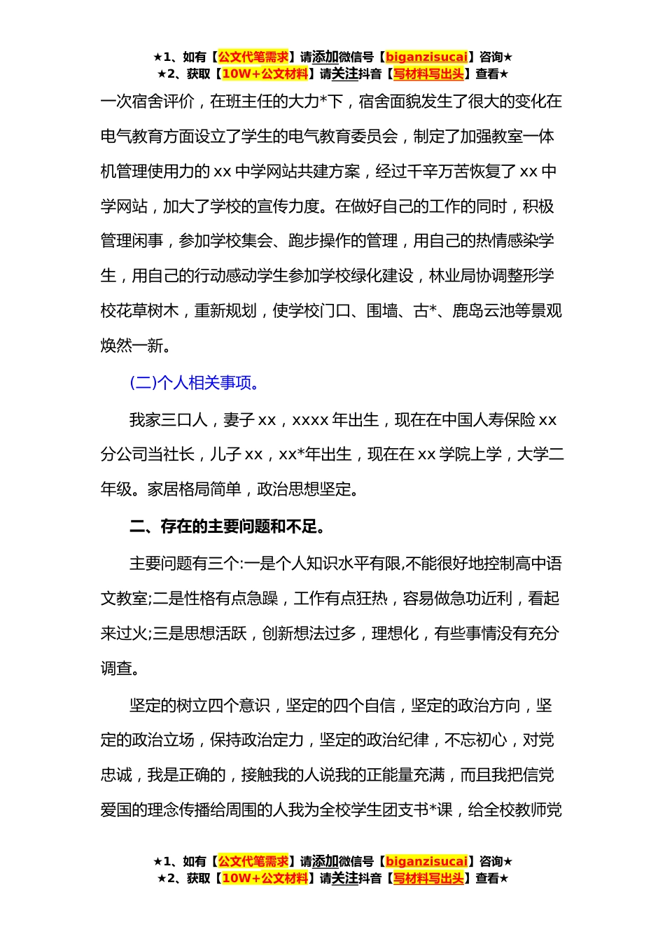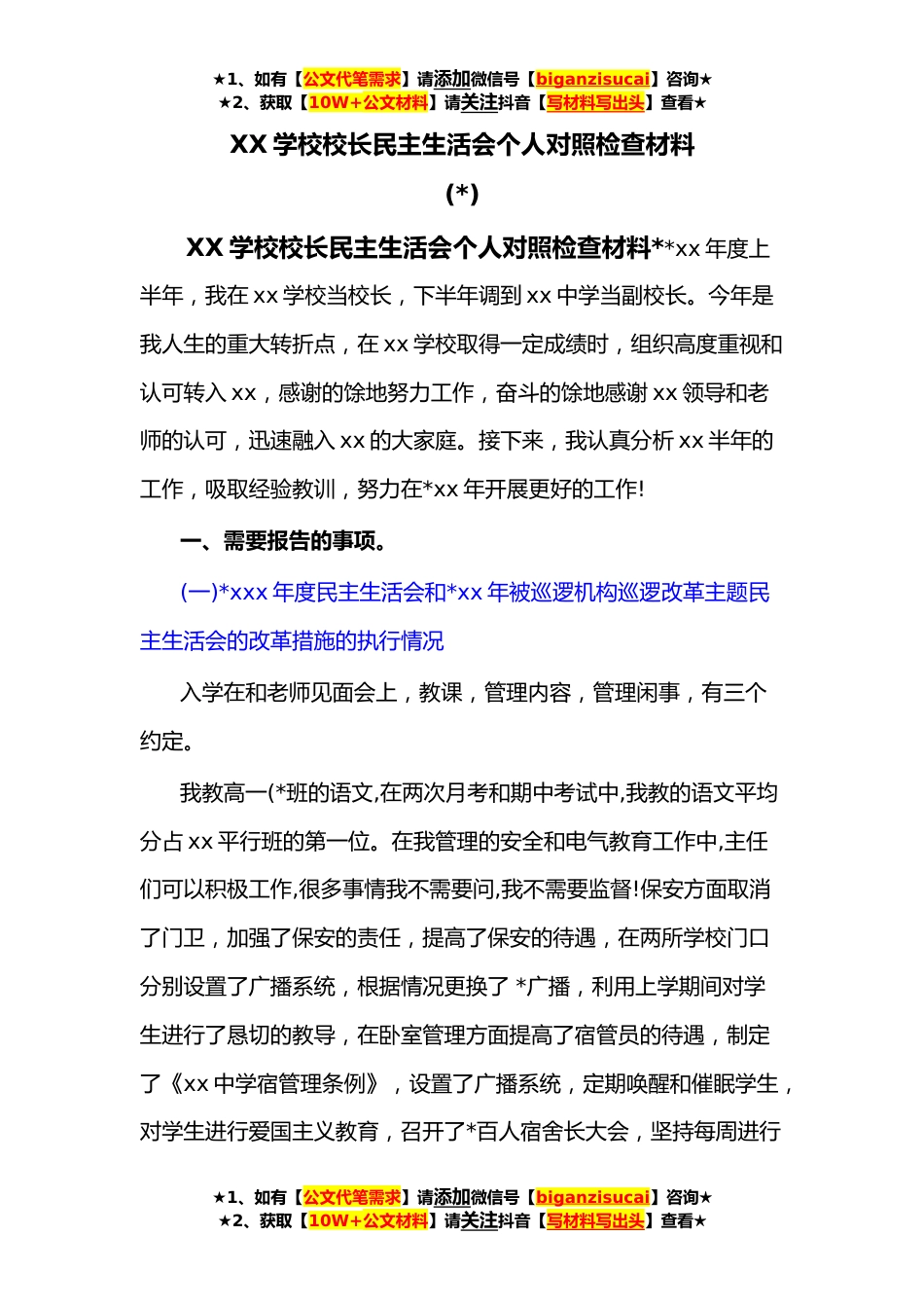 ★1、如有【公文代笔需求】请添加微信号【biganzisucai】咨询★★2、获取【10W+公文材料】请关注抖音【写材料写出头】查看★XX学校校长民主生活会个人对照检查材料(*)XX学校校长民主生活会个人对照检查材料**xx年度上半年,我在xx学校当校长,下半年调到xx中学当副校长。今年是我人生的重大转折点,在xx学校取得一定成绩时,组织高度重视和认可转入xx,感谢的馀地努力工作,奋斗的馀地感谢xx领导和老师的认可,迅速融入xx的大家庭。接下来,我认真分析xx半年的工作,吸取经验教训,努力在*xx年开展更好的工作!一、需要报告的事项。(一)*xxx年度民主生活会和*xx年被巡逻机构巡逻改革主题民主生活会的改革措施的执行情况入学在和老师见面会上,教课,管理内容,管理闲事,有三个约定。我教高一(*班的语文,在两次月考...