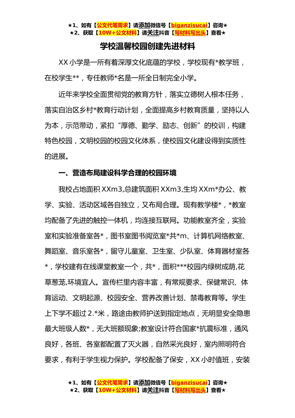★1、如有【公文代笔需求】请添加微信号【biganzisucai】咨询★★2、获取【10W+公文材料】请关注抖音【写材料写出头】查看★学校温馨校园创建先进材料XX小学是一所有着深厚文化底蕴的学校,学校现有*教学班,在校学生**,专任教师*名是一所全日制完全小学。近年来学校全面贯彻党的教育方针,落实立德树人根本任务,落实自治区乡村*教育行动计划,全面提高乡村教育质量,坚持以人为本,示范带动,紧扣“厚德、勤学、励志、创新”的校训,构建特色校园,文明校园的校园文化体系,使校园文化建设得到实质性的进展。一、营造布局建设科学合理的校园环境我校占地面积XXm3,总建筑面积XXm3,生均XXm*办公、教学、实验、活动区域各自独立,又布局合理。现有教学楼*,*教室均配备了先进的触控一体机,均连接互联网。功能教室...
