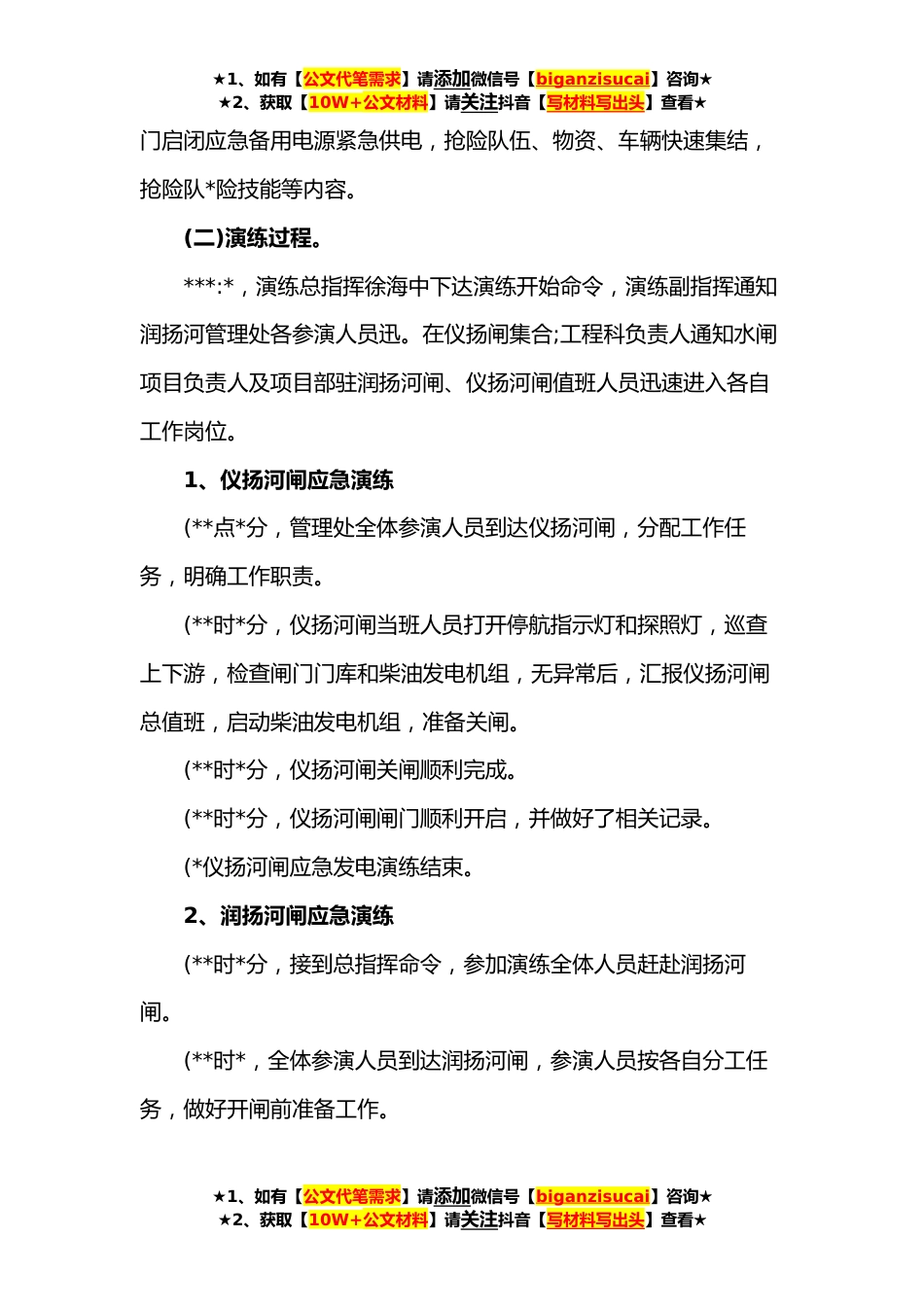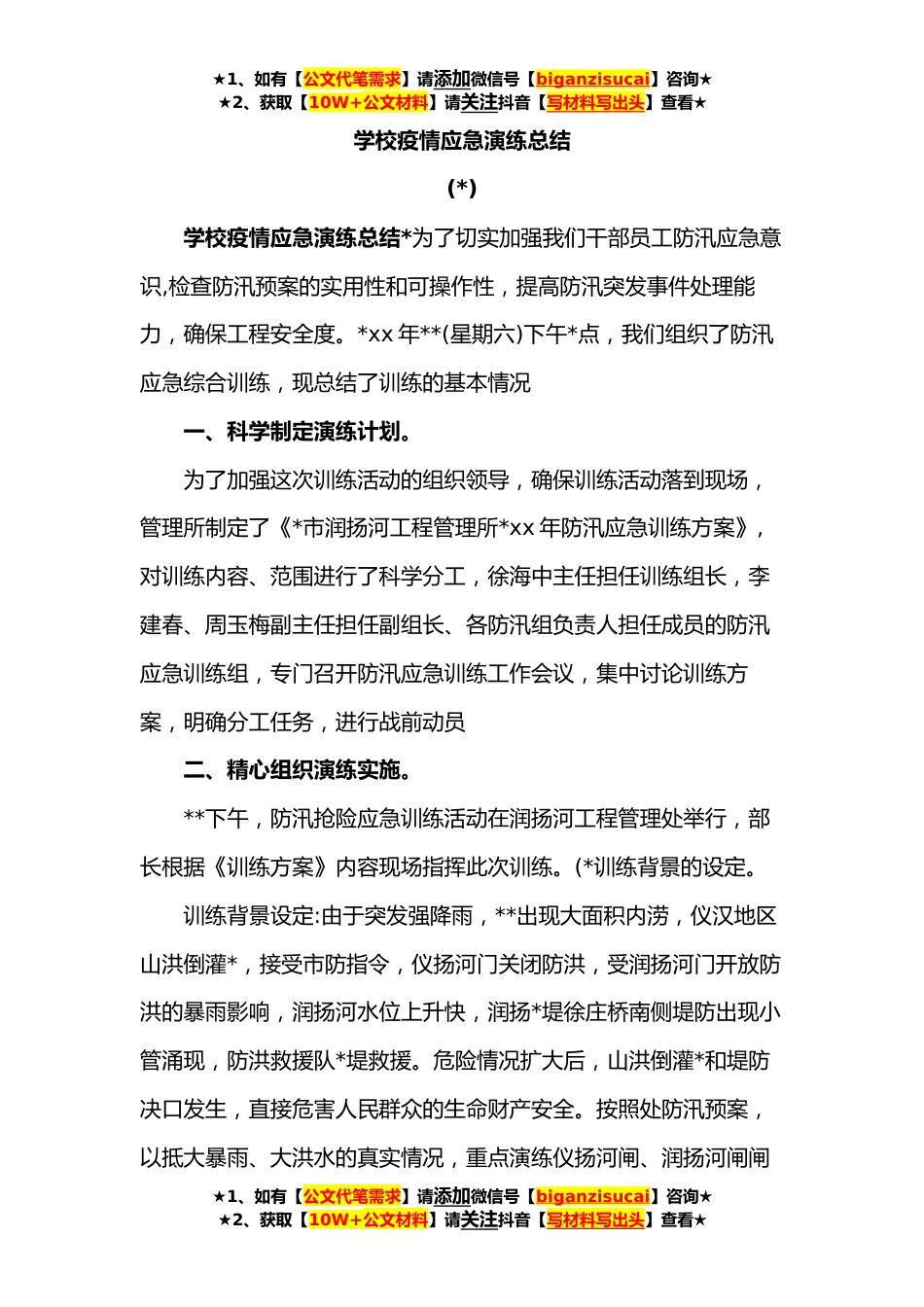 ★1、如有【公文代笔需求】请添加微信号【biganzisucai】咨询★★2、获取【10W+公文材料】请关注抖音【写材料写出头】查看★学校疫情应急演练总结(*)学校疫情应急演练总结*为了切实加强我们干部员工防汛应急意识,检查防汛预案的实用性和可操作性,提高防汛突发事件处理能力,确保工程安全度。*xx年**(星期六)下午*点,我们组织了防汛应急综合训练,现总结了训练的基本情况一、科学制定演练计划。为了加强这次训练活动的组织领导,确保训练活动落到现场,管理所制定了《*市润扬河工程管理所*xx年防汛应急训练方案》,对训练内容、范围进行了科学分工,徐海中主任担任训练组长,李建春、周玉梅副主任担任副组长、各防汛组负责人担任成员的防汛应急训练组,专门召开防汛应急训练工作会议,集中讨论训练方案,明确分工...