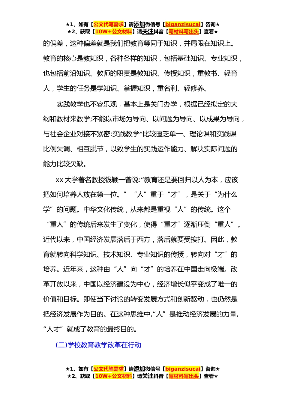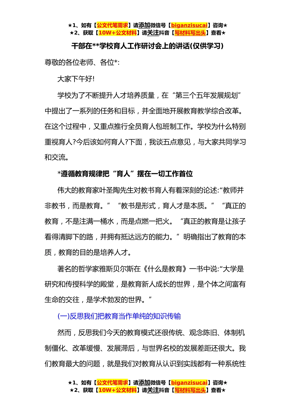 ★1、如有【公文代笔需求】请添加微信号【biganzisucai】咨询★★2、获取【10W+公文材料】请关注抖音【写材料写出头】查看★干部在**学校育人工作研讨会上的讲话(仅供学习)尊敬的各位老师、各位*:大家下午好!学校为了不断提升人才培养质量,在“第三个五年发展规划”中提出了一系列的任务和目标,并全面地开展教育教学综合改革。在这个过程中,又重点推行全员育人包班制工作。学校为什么特别重视育人?今后该如何育人?下面,我谈五点意见,与大家共同学习和交流。*遵循教育规律把“育人”摆在一切工作首位伟大的教育家叶圣陶先生对教书育人有着深刻的论述:“教师并非教书,而是教育。”“教书是形式,育人才是本质。”“真正的教育,不是注满一桶水,而是点燃一把火。“真正的教育是让孩子看得清脚下的路,并拥有抵...
