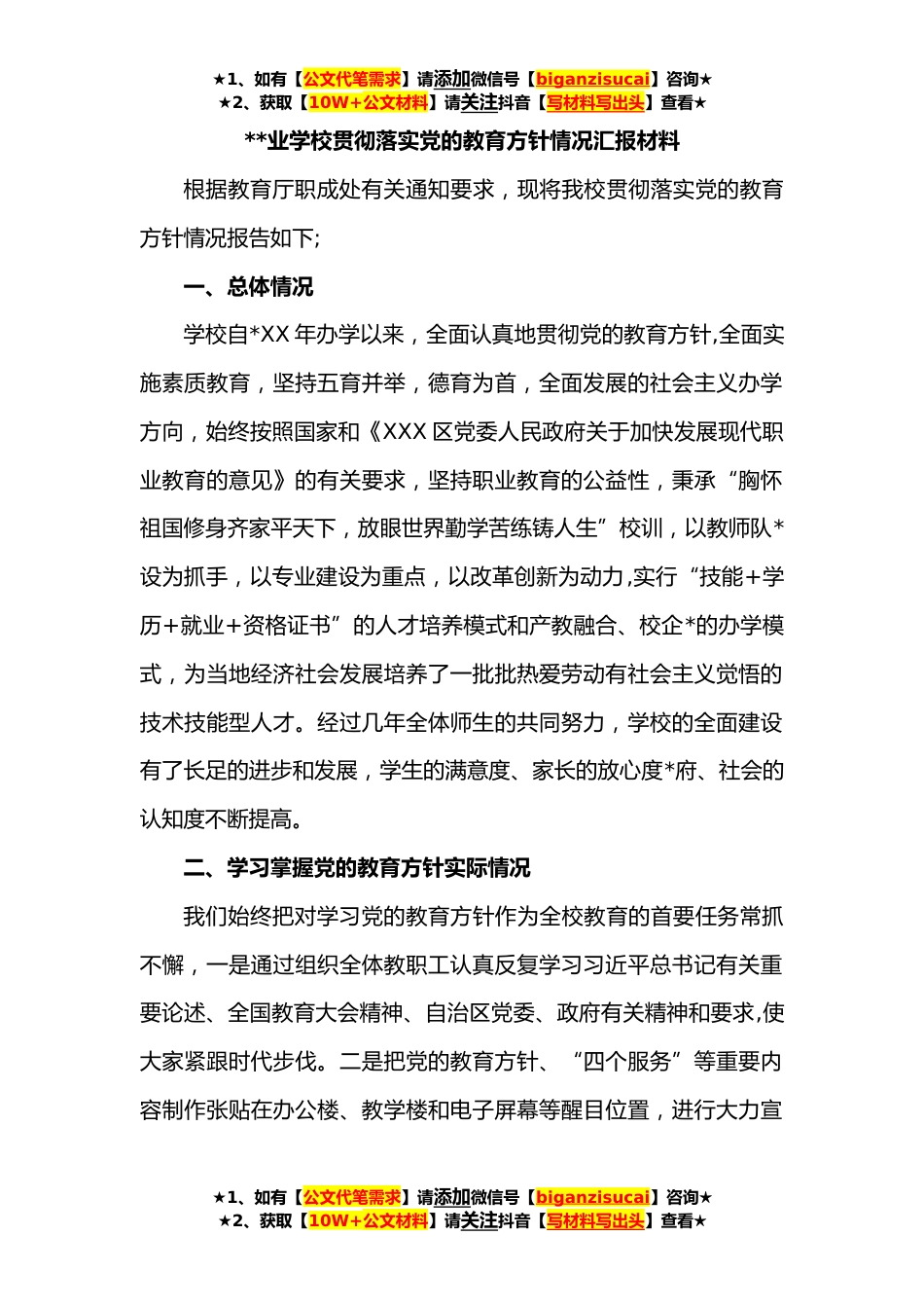 ★1、如有【公文代笔需求】请添加微信号【biganzisucai】咨询★★2、获取【10W+公文材料】请关注抖音【写材料写出头】查看★**业学校贯彻落实党的教育方针情况汇报材料根据教育厅职成处有关通知要求,现将我校贯彻落实党的教育方针情况报告如下;一、总体情况学校自*XX年办学以来,全面认真地贯彻党的教育方针,全面实施素质教育,坚持五育并举,德育为首,全面发展的社会主义办学方向,始终按照国家和《XXX区党委人民政府关于加快发展现代职业教育的意见》的有关要求,坚持职业教育的公益性,秉承“胸怀祖国修身齐家平天下,放眼世界勤学苦练铸人生”校训,以教师队*设为抓手,以专业建设为重点,以改革创新为动力,实行“技能+学历+就业+资格证书”的人才培养模式和产教融合、校企*的办学模式,为当地经济社会发展...