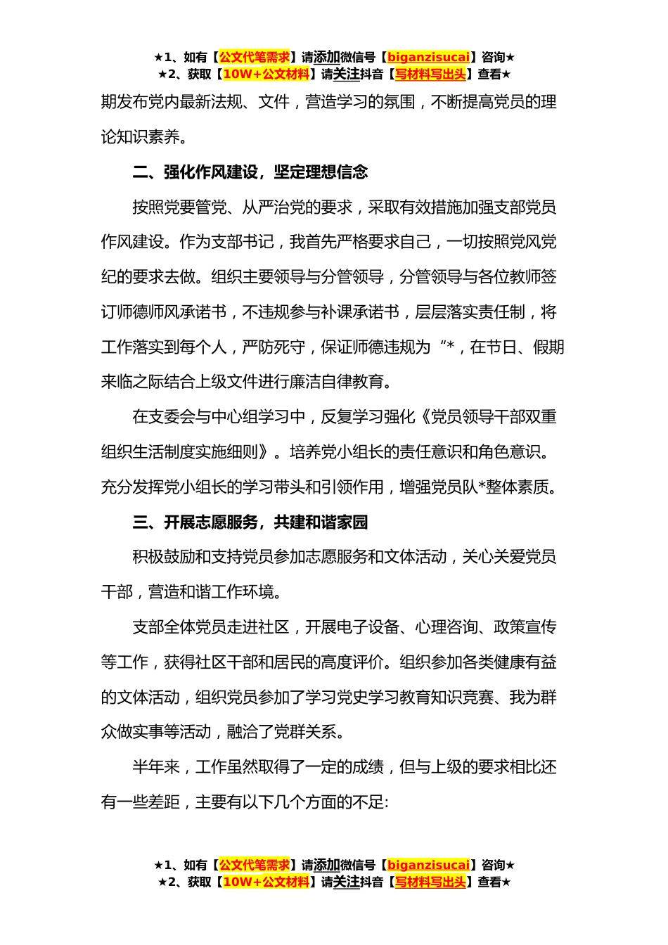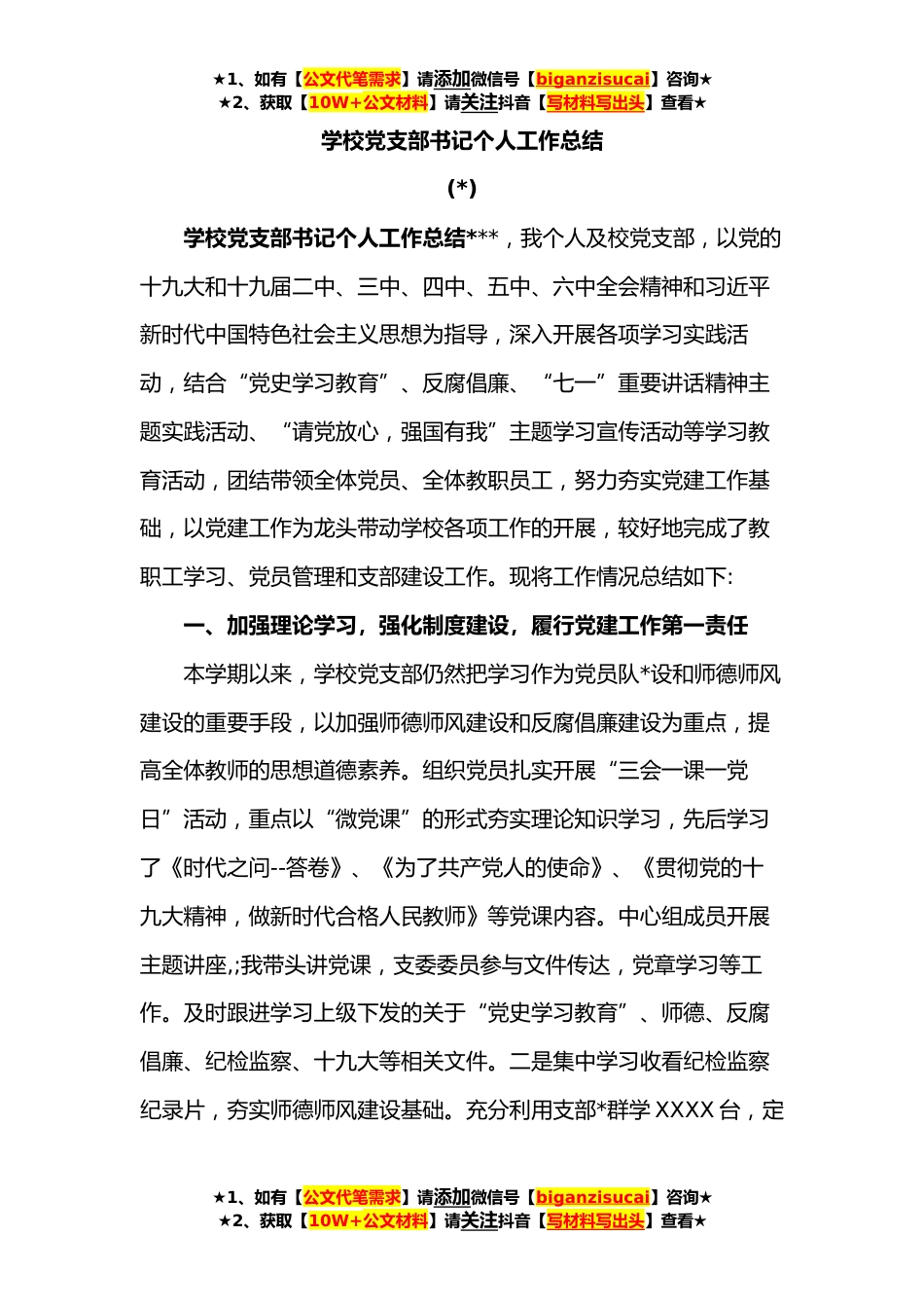 ★1、如有【公文代笔需求】请添加微信号【biganzisucai】咨询★★2、获取【10W+公文材料】请关注抖音【写材料写出头】查看★学校党支部书记个人工作总结(*)学校党支部书记个人工作总结***,我个人及校党支部,以党的十九大和十九届二中、三中、四中、五中、六中全会精神和习近平新时代中国特色社会主义思想为指导,深入开展各项学习实践活动,结合“党史学习教育”、反腐倡廉、“七一”重要讲话精神主题实践活动、“请党放心,强国有我”主题学习宣传活动等学习教育活动,团结带领全体党员、全体教职员工,努力夯实党建工作基础,以党建工作为龙头带动学校各项工作的开展,较好地完成了教职工学习、党员管理和支部建设工作。现将工作情况总结如下:一、加强理论学习,强化制度建设,履行党建工作第一责任本学期以来...