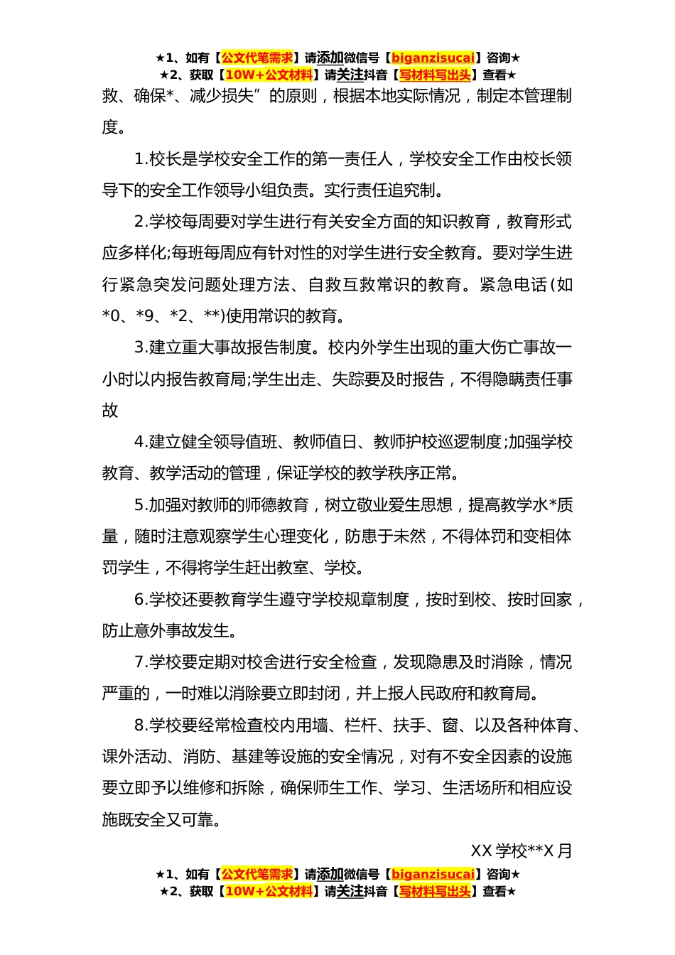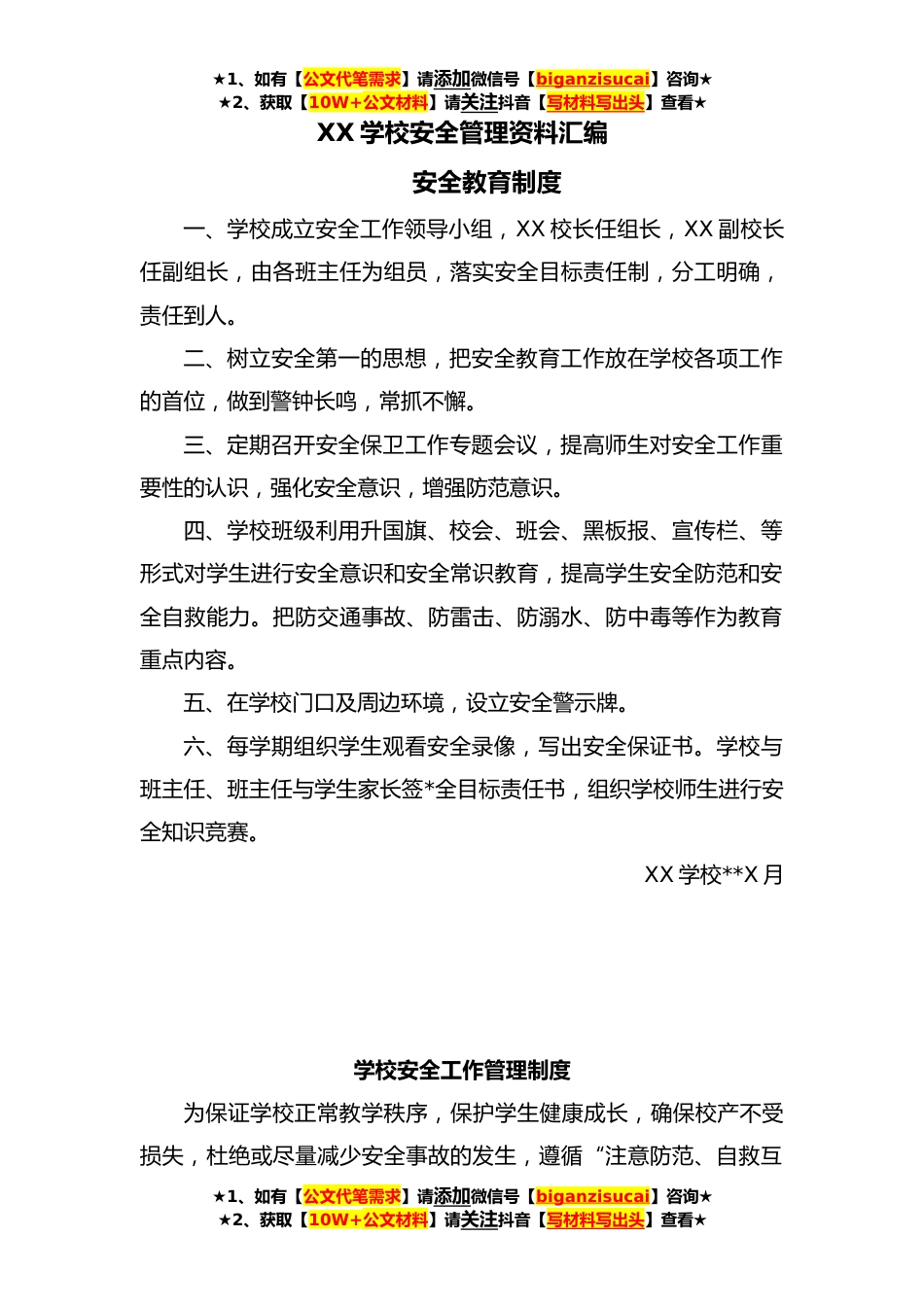 ★1、如有【公文代笔需求】请添加微信号【biganzisucai】咨询★★2、获取【10W+公文材料】请关注抖音【写材料写出头】查看★XX学校安全管理资料汇编安全教育制度一、学校成立安全工作领导小组,XX校长任组长,XX副校长任副组长,由各班主任为组员,落实安全目标责任制,分工明确,责任到人。二、树立安全第一的思想,把安全教育工作放在学校各项工作的首位,做到警钟长鸣,常抓不懈。三、定期召开安全保卫工作专题会议,提高师生对安全工作重要性的认识,强化安全意识,增强防范意识。四、学校班级利用升国旗、校会、班会、黑板报、宣传栏、等形式对学生进行安全意识和安全常识教育,提高学生安全防范和安全自救能力。把防交通事故、防雷击、防溺水、防中毒等作为教育重点内容。五、在学校门口及周边环境,设立安...
