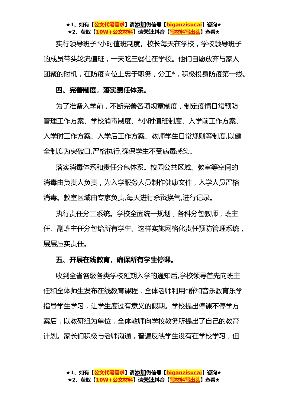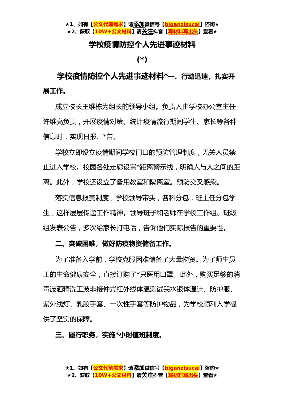 ★1、如有【公文代笔需求】请添加微信号【biganzisucai】咨询★★2、获取【10W+公文材料】请关注抖音【写材料写出头】查看★学校疫情防控个人先进事迹材料(*)学校疫情防控个人先进事迹材料*一、行动迅速,扎实开展工作。成立校长王维栋为组长的领导小组。负责人由学校办公室主任许维亮负责,开展疫情对策。统计疫情流行期间学生、家长等各种信息时,实现日报、*告。学校立即设立疫情期间学校门口的预防管理制度,无关人员禁止进入学校。校园各处走廊设置*距离警示线,明确人与人之间的距离。此外,学校还设立了备用教室和隔离室。预防交叉感染。落实信息报责制度,学校领导带头,各科分包,班主任分包学生,这样层层传递工作精神。领导班子和老师在学校工作组、班级组发表公告,多次给家长打电话,告诉他们实际报...