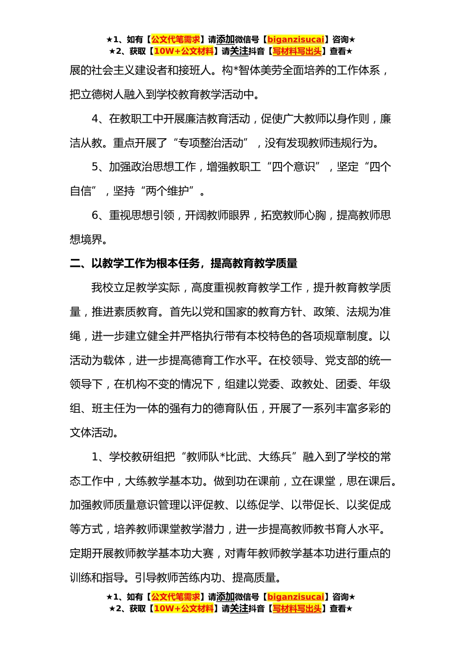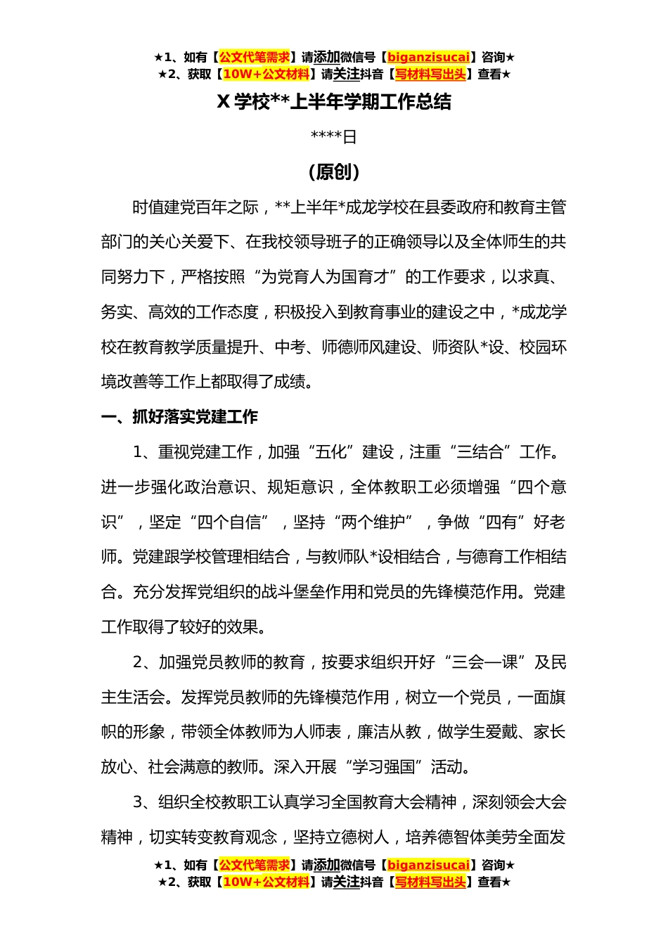 ★1、如有【公文代笔需求】请添加微信号【biganzisucai】咨询★★2、获取【10W+公文材料】请关注抖音【写材料写出头】查看★X学校**上半年学期工作总结****日(原创)时值建党百年之际,**上半年*成龙学校在县委政府和教育主管部门的关心关爱下、在我校领导班子的正确领导以及全体师生的共同努力下,严格按照“为党育人为国育才”的工作要求,以求真、务实、高效的工作态度,积极投入到教育事业的建设之中,*成龙学校在教育教学质量提升、中考、师德师风建设、师资队*设、校园环境改善等工作上都取得了成绩。一、抓好落实党建工作1、重视党建工作,加强“五化”建设,注重“三结合”工作。进一步强化政治意识、规矩意识,全体教职工必须增强“四个意识”,坚定“四个自信”,坚持“两个维护”,争做“四有”好老师...