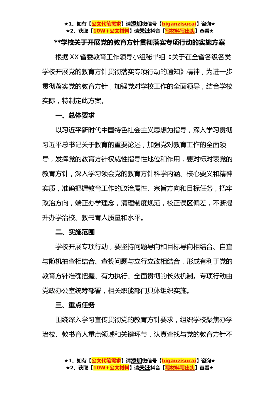 ★1、如有【公文代笔需求】请添加微信号【biganzisucai】咨询★★2、获取【10W+公文材料】请关注抖音【写材料写出头】查看★**学校关于开展党的教育方针贯彻落实专项行动的实施方案根据XX省委教育工作领导小组秘书组《关于在全省各级各类学校开展党的教育方针贯彻落实专项行动的通知》精神,为进一步贯彻落实党的教育方针,加强党对学校工作的全面领导,结合学校实际,特制定此方案。一、总体要求以习近平新时代中国特色社会主义思想为指导,深入学习贯彻习近平总书记关于教育的重要论述,加强党对教育工作的全面领导,发挥党的教育方针权威性指导性地位和作用,要对标对表党的教育方针,深入学习领会党的教育方针科学内涵、核心要义和精神实质,准确把握教育工作的政治属性、宗旨方向和目标任务,把牢政治方向,...