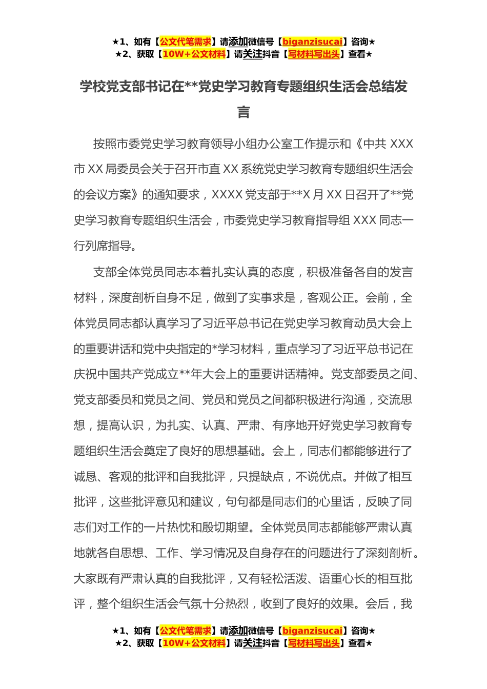 ★1、如有【公文代笔需求】请添加微信号【biganzisucai】咨询★★2、获取【10W+公文材料】请关注抖音【写材料写出头】查看★学校党支部书记在**党史学习教育专题组织生活会总结发言按照市委党史学习教育领导小组办公室工作提示和《中共XXX市XX局委员会关于召开市直XX系统党史学习教育专题组织生活会的会议方案》的通知要求,XXXX党支部于**X月XX日召开了**党史学习教育专题组织生活会,市委党史学习教育指导组XXX同志一行列席指导。支部全体党员同志本着扎实认真的态度,积极准备各自的发言材料,深度剖析自身不足,做到了实事求是,客观公正。会前,全体党员同志都认真学习了习近平总书记在党史学习教育动员大会上的重要讲话和党中央指定的*学习材料,重点学习了习近平总书记在庆祝中国共产党成立**年大会上的重...