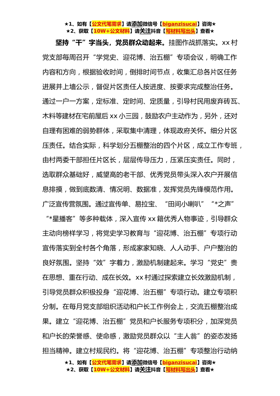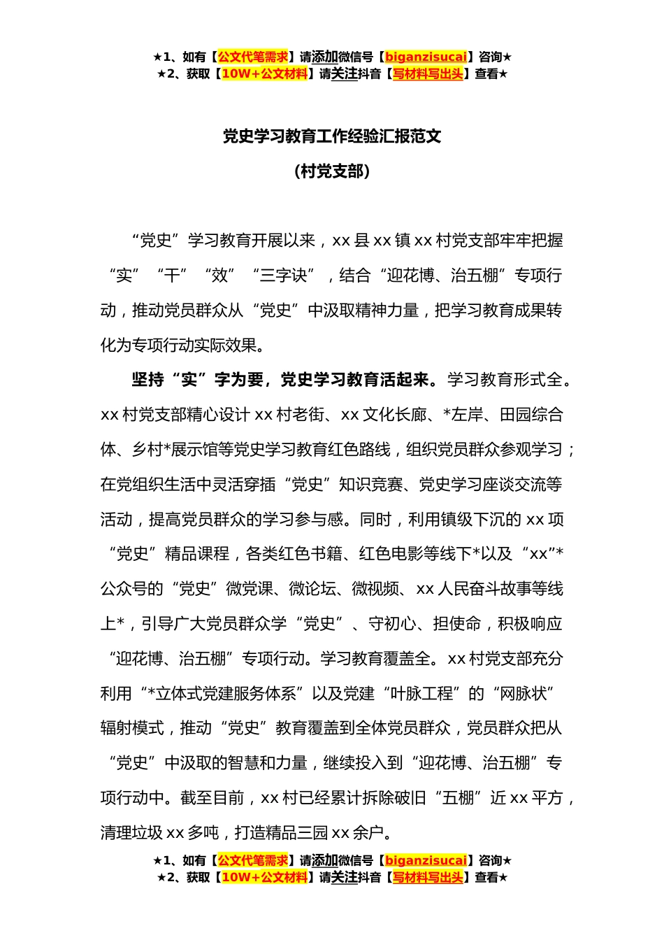 ★1、如有【公文代笔需求】请添加微信号【biganzisucai】咨询★★2、获取【10W+公文材料】请关注抖音【写材料写出头】查看★党史学习教育工作经验汇报范文(村党支部)“党史”学习教育开展以来,xx县xx镇xx村党支部牢牢把握“实”“干”“效”“三字诀”,结合“迎花博、治五棚”专项行动,推动党员群众从“党史”中汲取精神力量,把学习教育成果转化为专项行动实际效果。坚持“实”字为要,党史学习教育活起来。学习教育形式全。xx村党支部精心设计xx村老街、xx文化长廊、*左岸、田园综合体、乡村*展示馆等党史学习教育红色路线,组织党员群众参观学习;在党组织生活中灵活穿插“党史”知识竞赛、党史学习座谈交流等活动,提高党员群众的学习参与感。同时,利用镇级下沉的xx项“党史”精品课程,各类红色书籍、...