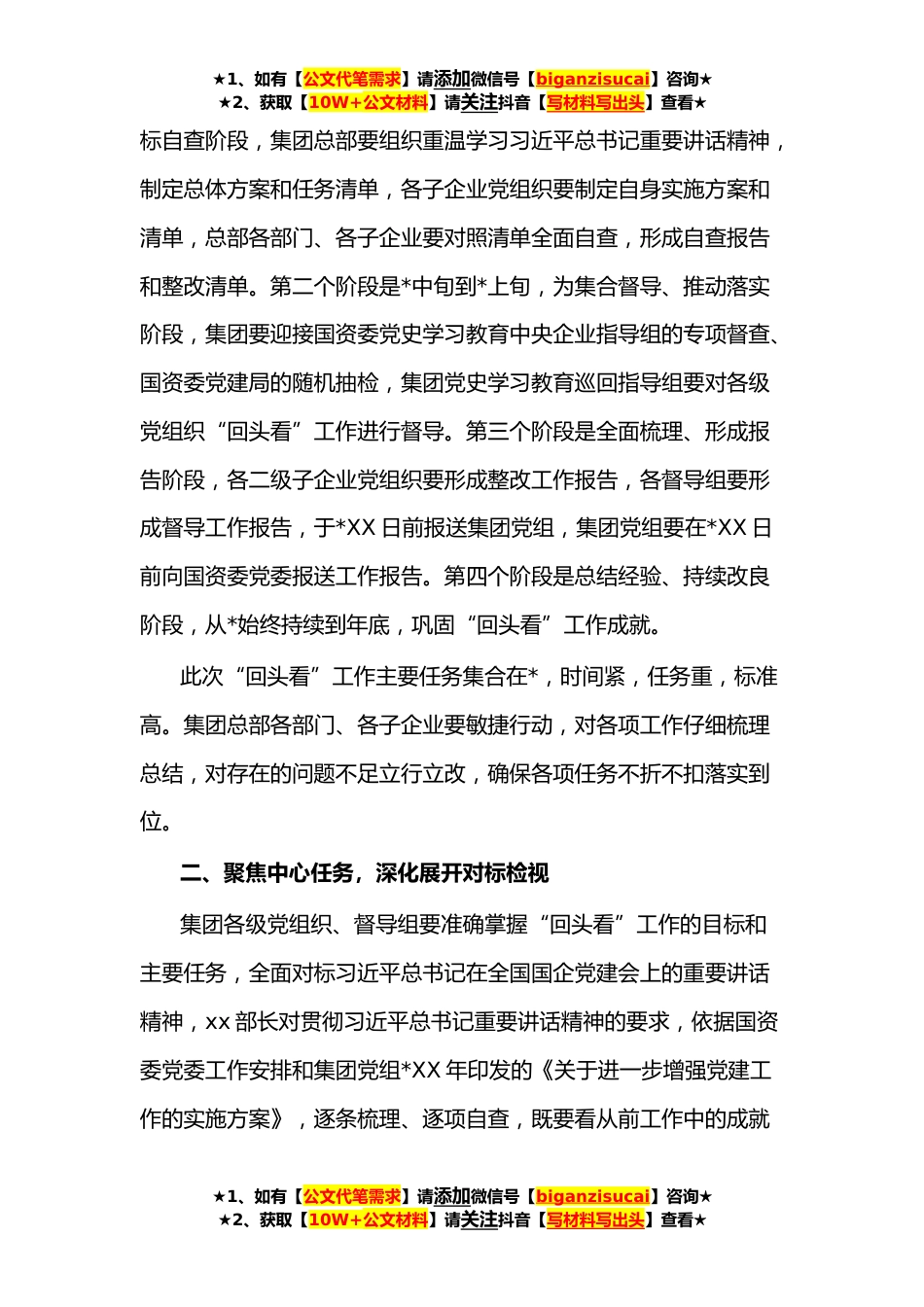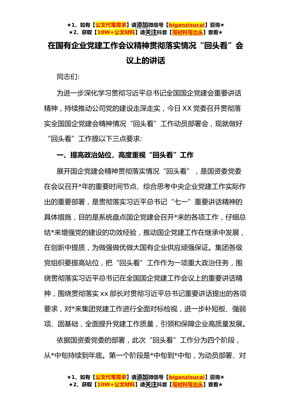 ★1、如有【公文代笔需求】请添加微信号【biganzisucai】咨询★★2、获取【10W+公文材料】请关注抖音【写材料写出头】查看★在国有企业党建工作会议精神贯彻落实情况“回头看”会议上的讲话同志们:为进一步深化学习贯彻习近平总书记全国国企党建会重要讲话精神,持续推动公司党的建设走深走实,今日XX党委召开贯彻落实全国国企党建会精神情况“回头看”工作动员部署会,现就做好“回头看”工作提以下三点要求:一、提高政治站位,高度重视“回头看”工作展开国企党建会精神贯彻落实情况“回头看”,是国资委党委在会议召开*年的重要时间节点、综合思考中央企业党建工作实际作出的重要部署,是贯彻落实习近平总书记“七一”重要讲话精神的具体措施,目的是系统盘点国企党建会召开*来的各项工作,仔细总结*来增强党的...