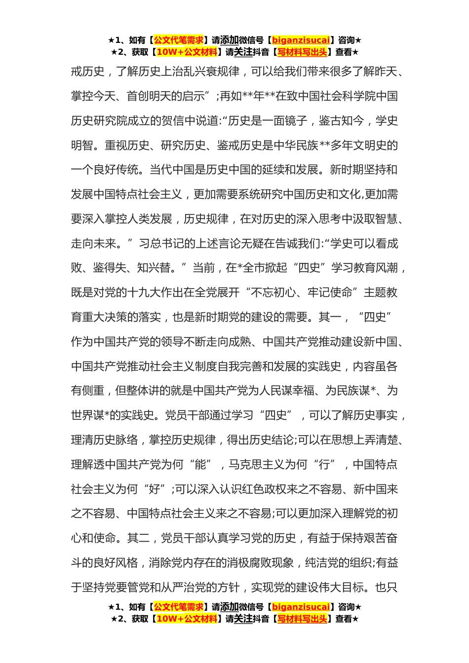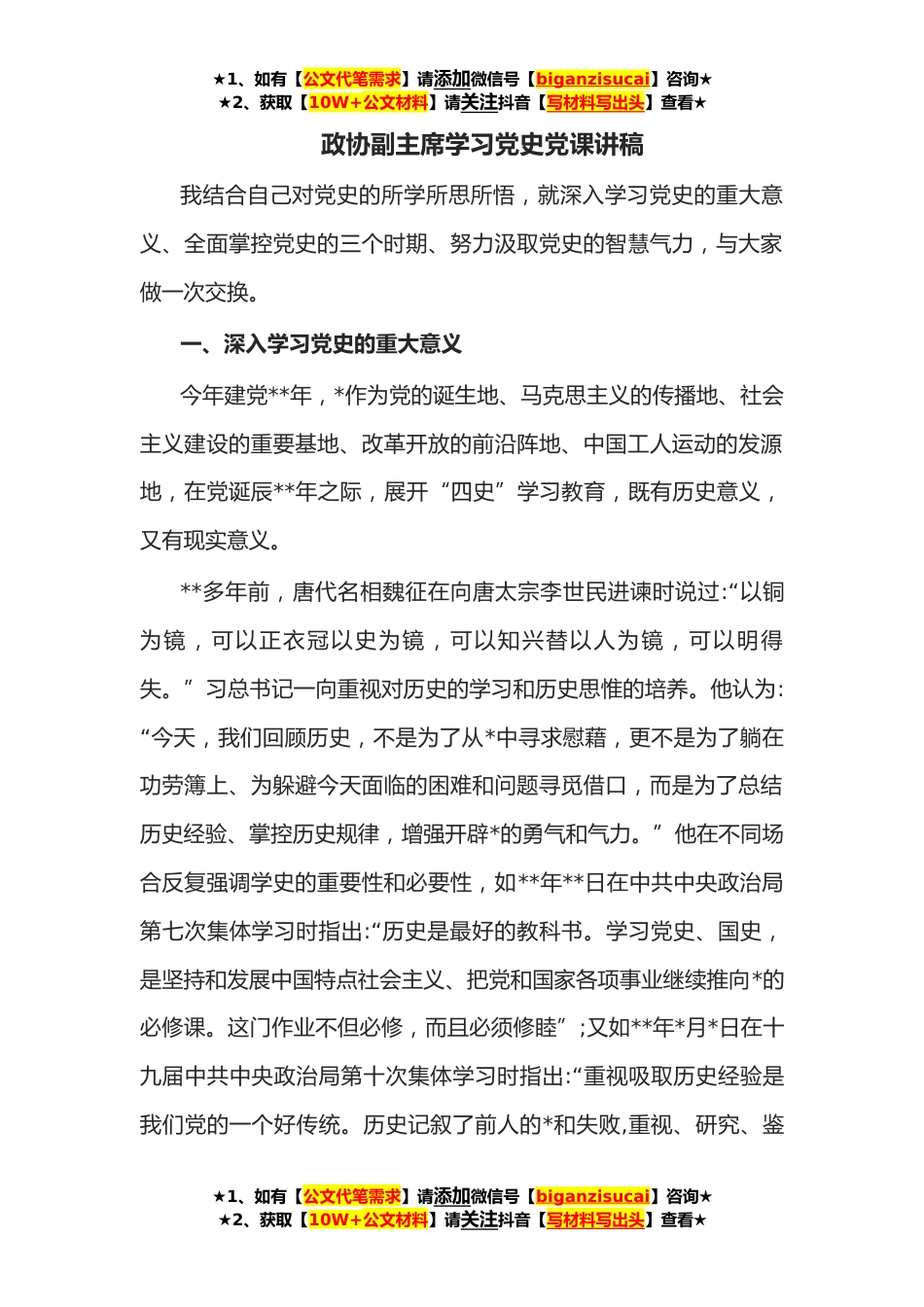 ★1、如有【公文代笔需求】请添加微信号【biganzisucai】咨询★★2、获取【10W+公文材料】请关注抖音【写材料写出头】查看★政协副主席学习党史党课讲稿我结合自己对党史的所学所思所悟,就深入学习党史的重大意义、全面掌控党史的三个时期、努力汲取党史的智慧气力,与大家做一次交换。一、深入学习党史的重大意义今年建党**年,*作为党的诞生地、马克思主义的传播地、社会主义建设的重要基地、改革开放的前沿阵地、中国工人运动的发源地,在党诞辰**年之际,展开“四史”学习教育,既有历史意义,又有现实意义。**多年前,唐代名相魏征在向唐太宗李世民进谏时说过:“以铜为镜,可以正衣冠以史为镜,可以知兴替以人为镜,可以明得失。”习总书记一向重视对历史的学习和历史思惟的培养。他认为:“今天,我们回顾历...