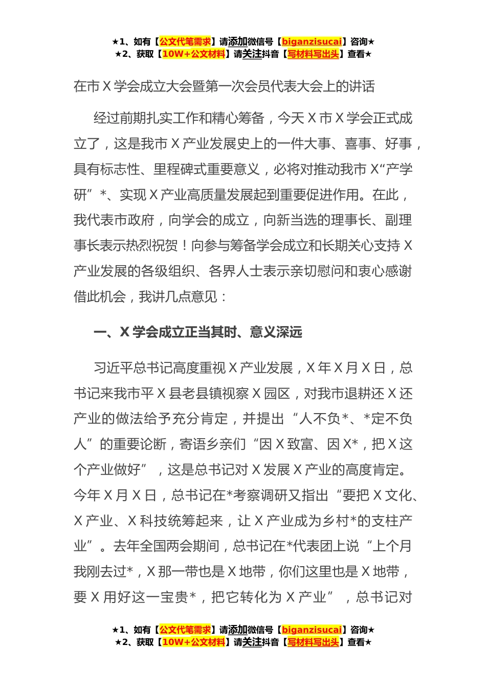 ★1、如有【公文代笔需求】请添加微信号【biganzisucai】咨询★★2、获取【10W+公文材料】请关注抖音【写材料写出头】查看★在市X学会成立大会暨第一次会员代表大会上的讲话经过前期扎实工作和精心筹备,今天X市X学会正式成立了,这是我市X产业发展史上的一件大事、喜事、好事,具有标志性、里程碑式重要意义,必将对推动我市X“产学研”*、实现X产业高质量发展起到重要促进作用。在此,我代表市政府,向学会的成立,向新当选的理事长、副理事长表示热烈祝贺!向参与筹备学会成立和长期关心支持X产业发展的各级组织、各界人士表示亲切慰问和衷心感谢借此机会,我讲几点意见:一、X学会成立正当其时、意义深远习近平总书记高度重视X产业发展,X年X月X日,总书记来我市平X县老县镇视察X园区,对我市退耕还X还产业的...