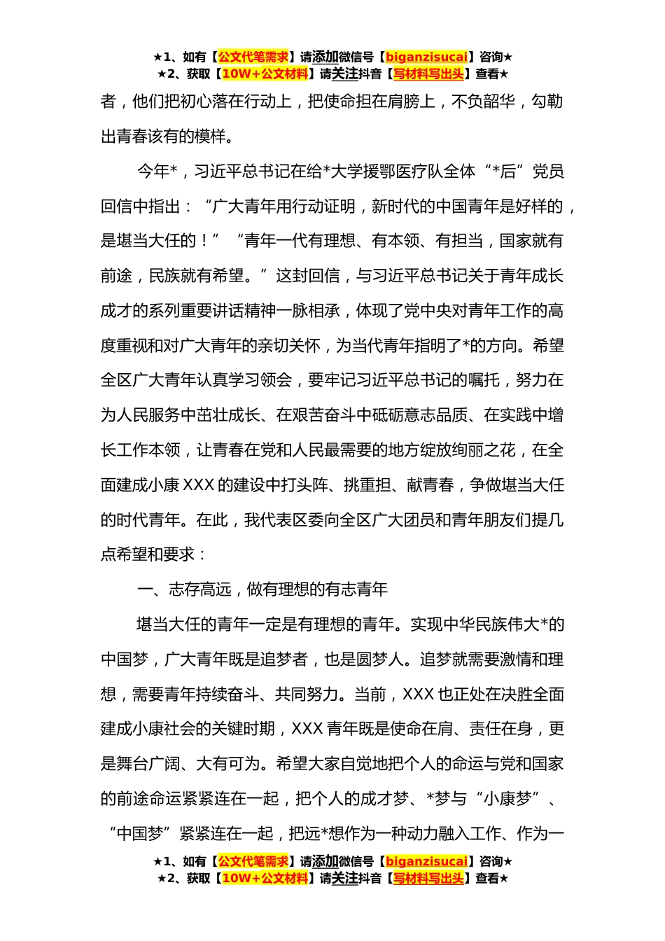 ★1、如有【公文代笔需求】请添加微信号【biganzisucai】咨询★★2、获取【10W+公文材料】请关注抖音【写材料写出头】查看★在纪念“五四”运动**年暨建团*年活动上的讲话青年朋友们、同志们:正值五四青年节即将来临之际,今天,我们在这里开展纪念“五四”运动**年暨建团*年活动,表彰**年度XXX区“五四*团委”、“五四*团支部”、“优秀团干部”和“优秀团员”。今天受表彰的先进集体和个人是我区青年在加快建成全面小康XXX以及在新冠肺炎疫情防控斗争中所涌现的优秀代表,充分体现出了我区青年勇于拼搏、积极进取的优秀形象,是全区青年学习的榜样。借此机会,我谨代表区委向受到表彰的先进集体和个人表示热烈的祝贺!向在座的各位,并通过你们向全区广大共青团员和青年朋友们致以节日的问候!“五四”运动具...