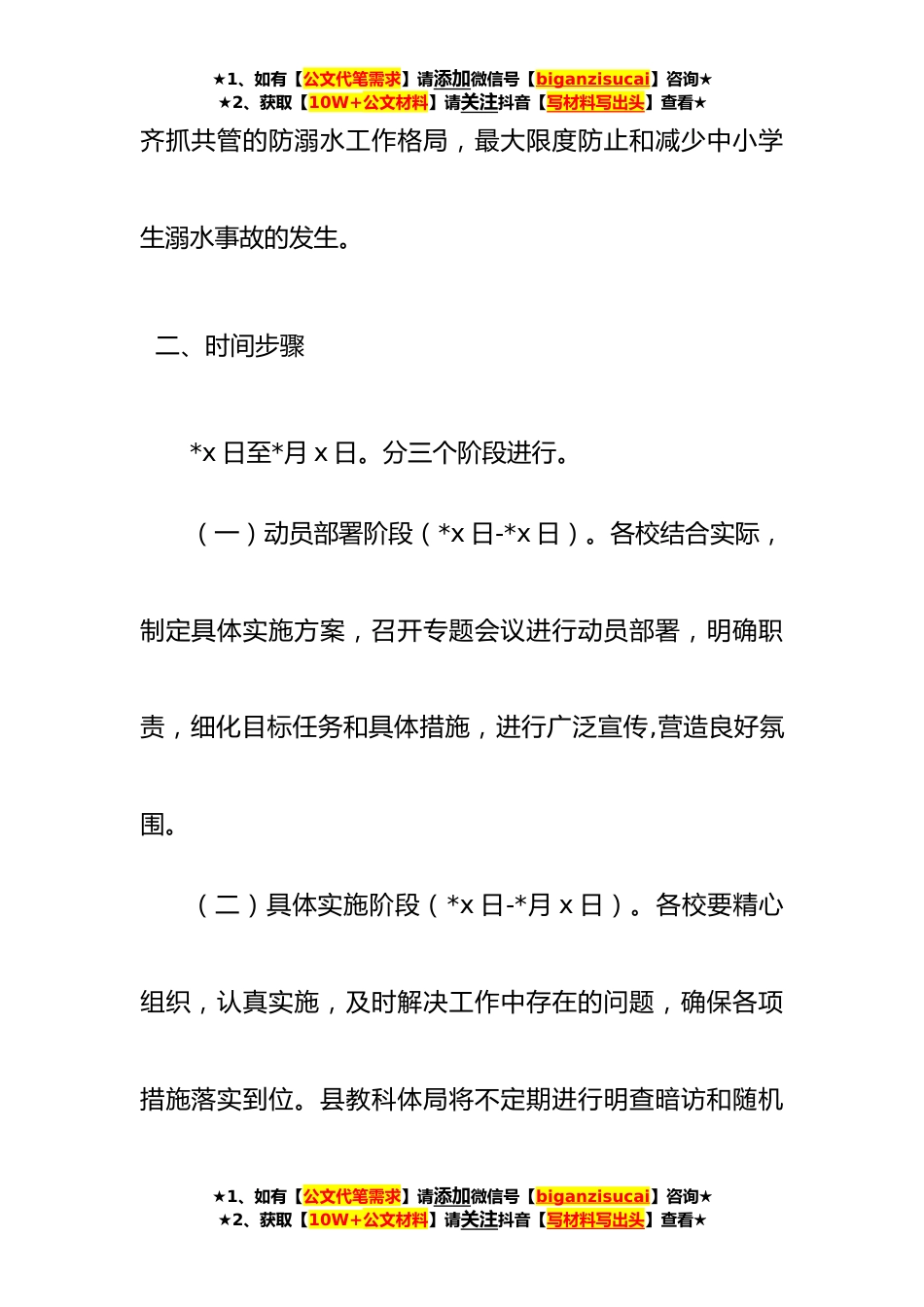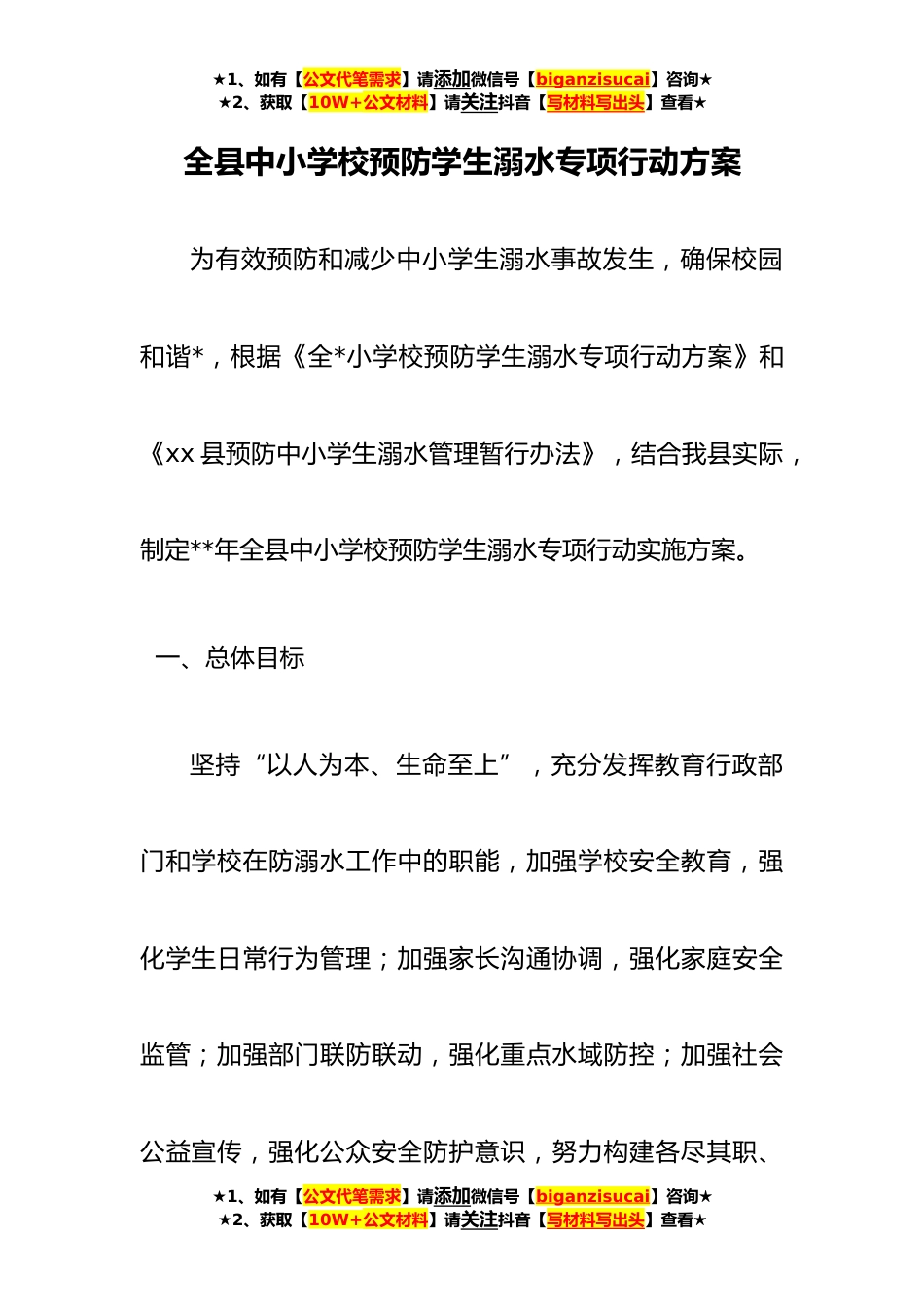 ★1、如有【公文代笔需求】请添加微信号【biganzisucai】咨询★★2、获取【10W+公文材料】请关注抖音【写材料写出头】查看★全县中小学校预防学生溺水专项行动方案为有效预防和减少中小学生溺水事故发生,确保校园和谐*,根据《全*小学校预防学生溺水专项行动方案》和《xx县预防中小学生溺水管理暂行办法》,结合我县实际,制定**年全县中小学校预防学生溺水专项行动实施方案。一、总体目标坚持“以人为本、生命至上”,充分发挥教育行政部门和学校在防溺水工作中的职能,加强学校安全教育,强化学生日常行为管理;加强家长沟通协调,强化家庭安全监管;加强部门联防联动,强化重点水域防控;加强社会公益宣传,强化公众安全防护意识,努力构建各尽其职、★1、如有【公文代笔需求】请添加微信号【biganzisucai】咨...