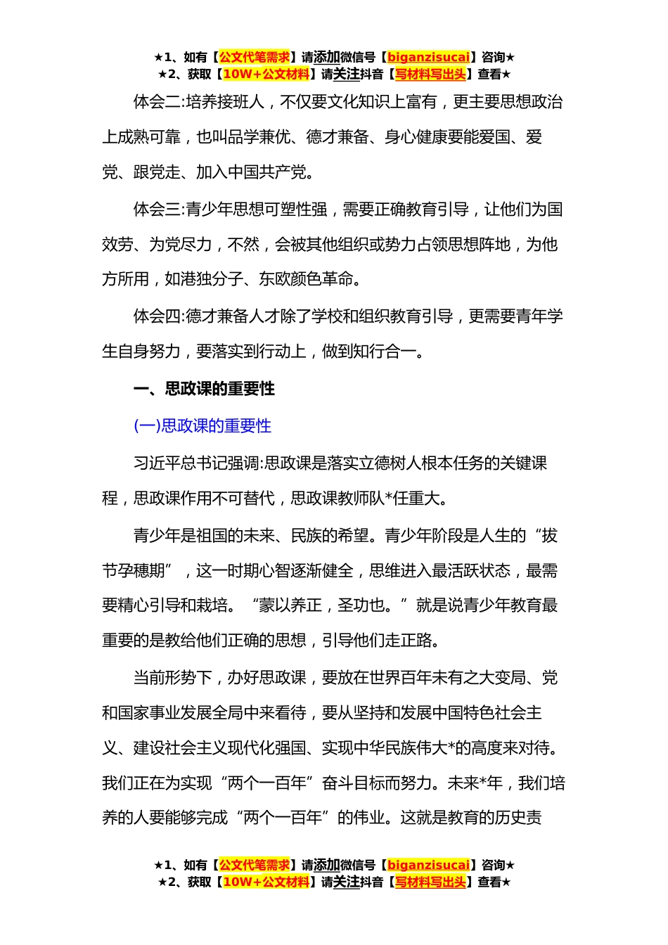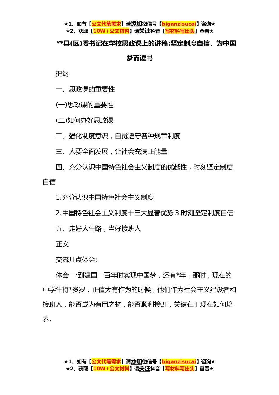 ★1、如有【公文代笔需求】请添加微信号【biganzisucai】咨询★★2、获取【10W+公文材料】请关注抖音【写材料写出头】查看★**县(区)委书记在学校思政课上的讲稿:坚定制度自信,为中国梦而读书提纲:一、思政课的重要性(一)思政课的重要性(二)如何办好思政课二、强化制度意识,自觉遵守各种规章制度三、人要全面发展,让社会充满正能量四、充分认识中国特色社会主义制度的优越性,时刻坚定制度自信1.充分认识中国特色社会主义制度2.中国特色社会主义制度十三大显著优势3.时刻坚定制度自信五、走好人生路,当好接班人正文:交流几点体会:体会一:到建国一百年时实现中国梦,还有*年,那时,现在的中学生将*多岁,正值大有作为的时候,他们作为社会主义建设者和接班人,能否成为有用之材,能否顺利接班,关键在于现在如...