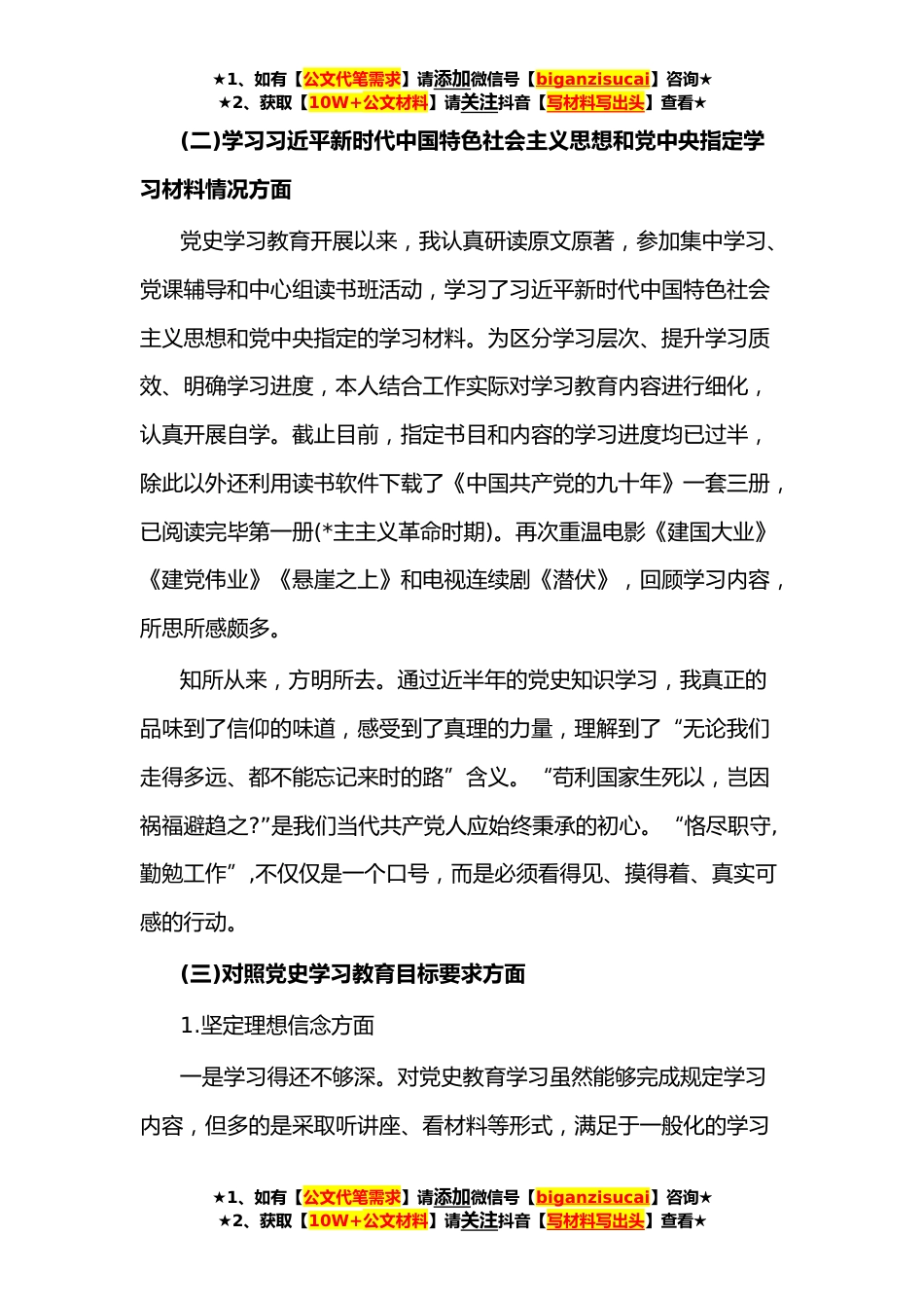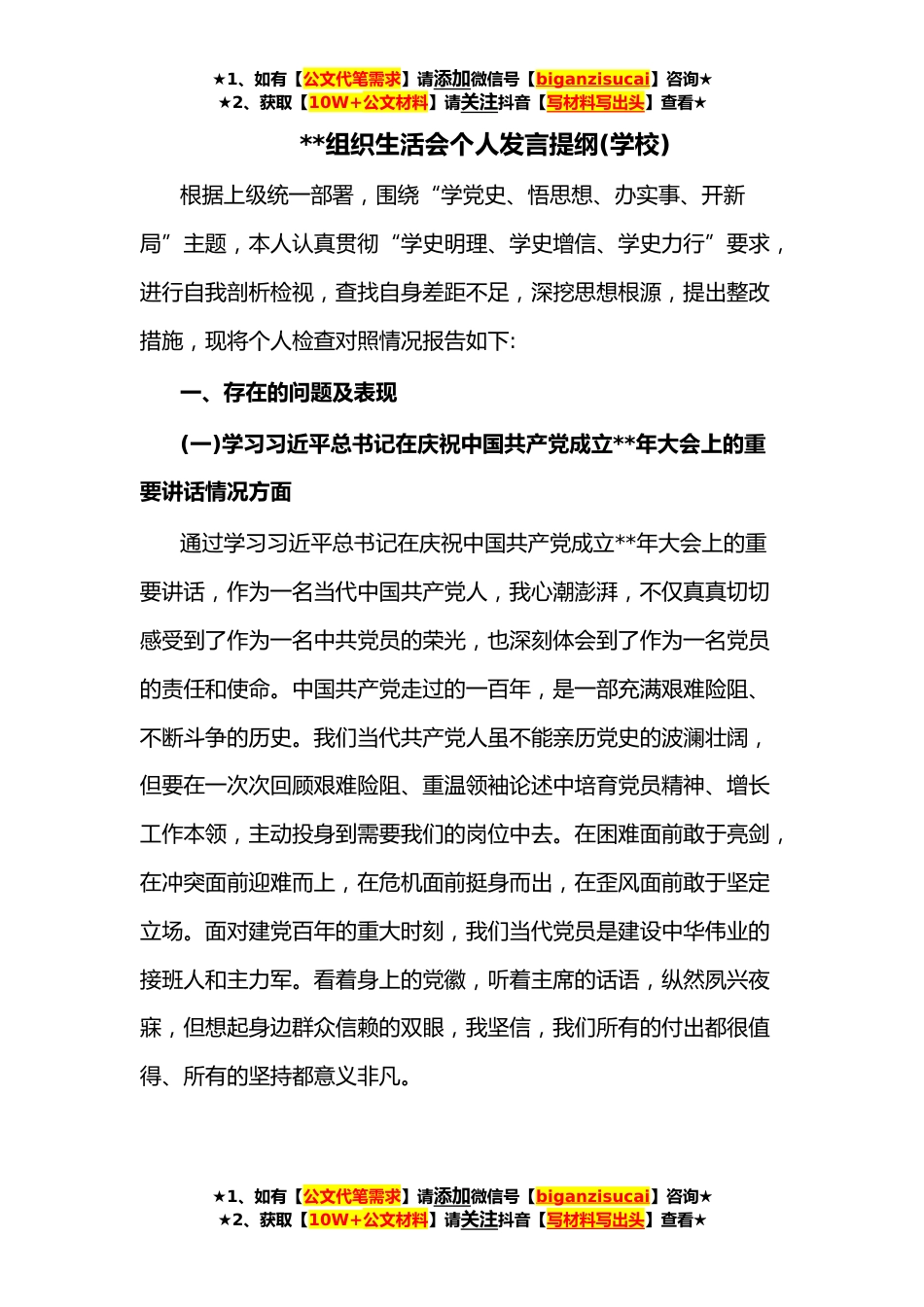 ★1、如有【公文代笔需求】请添加微信号【biganzisucai】咨询★★2、获取【10W+公文材料】请关注抖音【写材料写出头】查看★**组织生活会个人发言提纲(学校)根据上级统一部署,围绕“学党史、悟思想、办实事、开新局”主题,本人认真贯彻“学史明理、学史增信、学史力行”要求,进行自我剖析检视,查找自身差距不足,深挖思想根源,提出整改措施,现将个人检查对照情况报告如下:一、存在的问题及表现(一)学习习近平总书记在庆祝中国共产党成立**年大会上的重要讲话情况方面通过学习习近平总书记在庆祝中国共产党成立**年大会上的重要讲话,作为一名当代中国共产党人,我心潮澎湃,不仅真真切切感受到了作为一名中共党员的荣光,也深刻体会到了作为一名党员的责任和使命。中国共产党走过的一百年,是一部充满艰难险...