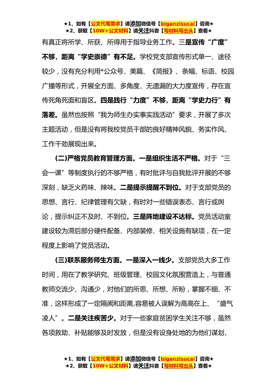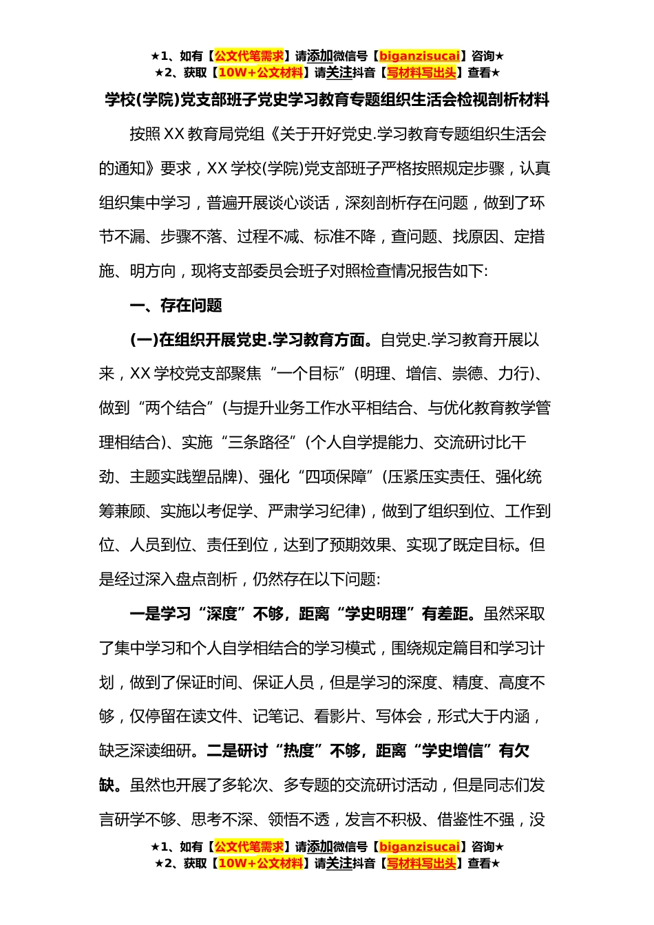 ★1、如有【公文代笔需求】请添加微信号【biganzisucai】咨询★★2、获取【10W+公文材料】请关注抖音【写材料写出头】查看★学校(学院)党支部班子党史学习教育专题组织生活会检视剖析材料按照XX教育局党组《关于开好党史.学习教育专题组织生活会的通知》要求,XX学校(学院)党支部班子严格按照规定步骤,认真组织集中学习,普遍开展谈心谈话,深刻剖析存在问题,做到了环节不漏、步骤不落、过程不减、标准不降,查问题、找原因、定措施、明方向,现将支部委员会班子对照检查情况报告如下:一、存在问题(一)在组织开展党史.学习教育方面。自党史.学习教育开展以来,XX学校党支部聚焦“一个目标”(明理、增信、崇德、力行)、做到“两个结合”(与提升业务工作水平相结合、与优化教育教学管理相结合)、实施“三条路径”(...