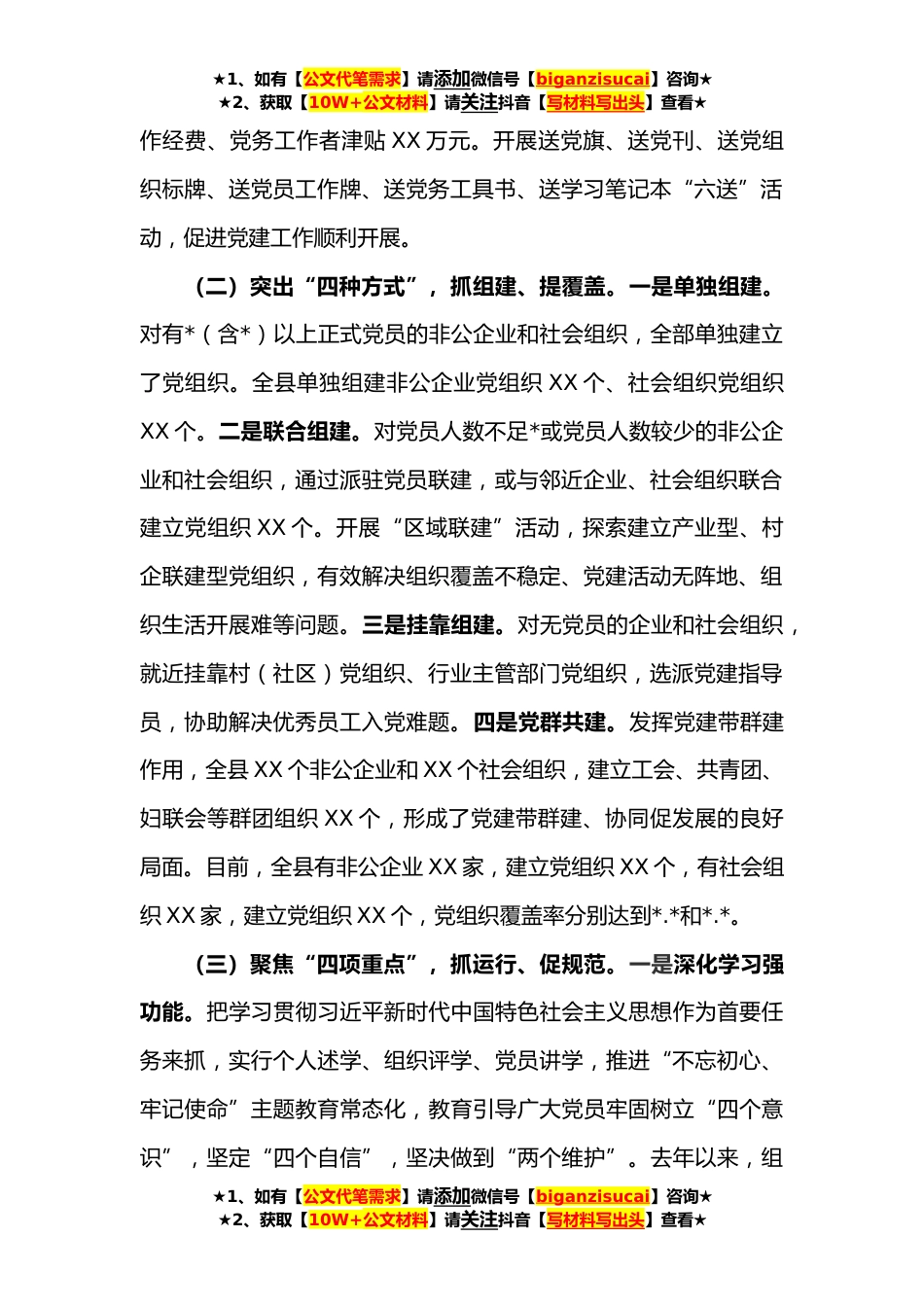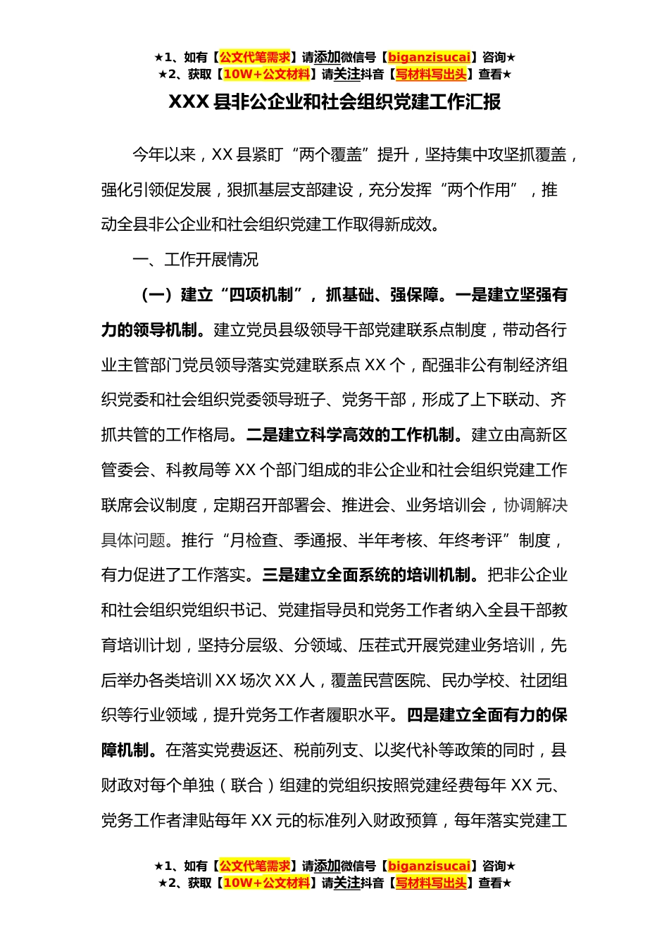 ★1、如有【公文代笔需求】请添加微信号【biganzisucai】咨询★★2、获取【10W+公文材料】请关注抖音【写材料写出头】查看★XXX县非公企业和社会组织党建工作汇报今年以来,XX县紧盯“两个覆盖”提升,坚持集中攻坚抓覆盖,强化引领促发展,狠抓基层支部建设,充分发挥“两个作用”,推动全县非公企业和社会组织党建工作取得新成效。一、工作开展情况(一)建立“四项机制”,抓基础、强保障。一是建立坚强有力的领导机制。建立党员县级领导干部党建联系点制度,带动各行业主管部门党员领导落实党建联系点XX个,配强非公有制经济组织党委和社会组织党委领导班子、党务干部,形成了上下联动、齐抓共管的工作格局。二是建立科学高效的工作机制。建立由高新区管委会、科教局等XX个部门组成的非公企业和社会组织党建工...