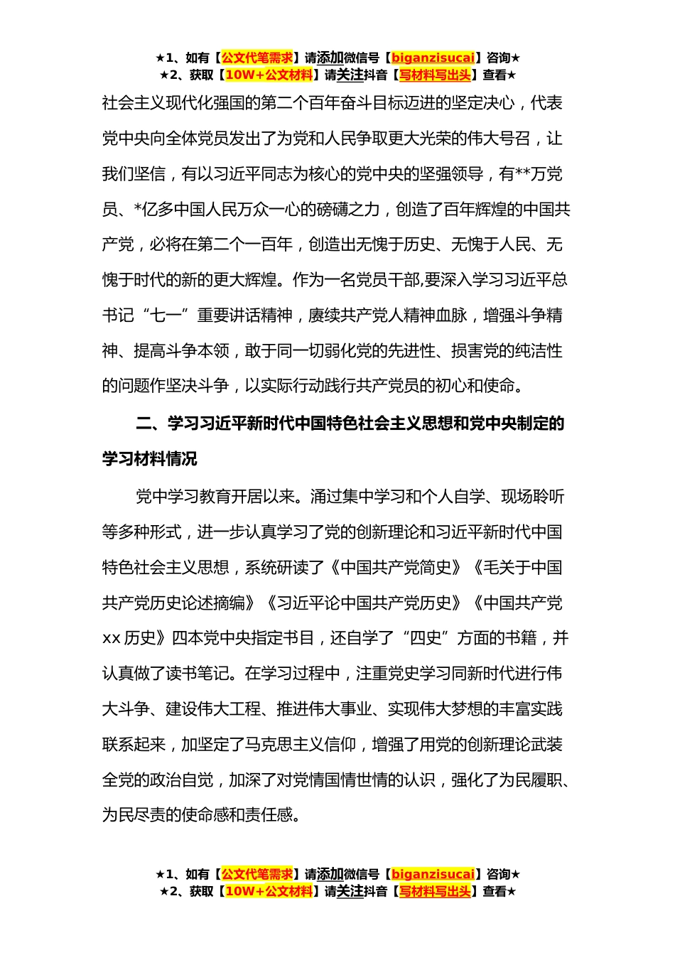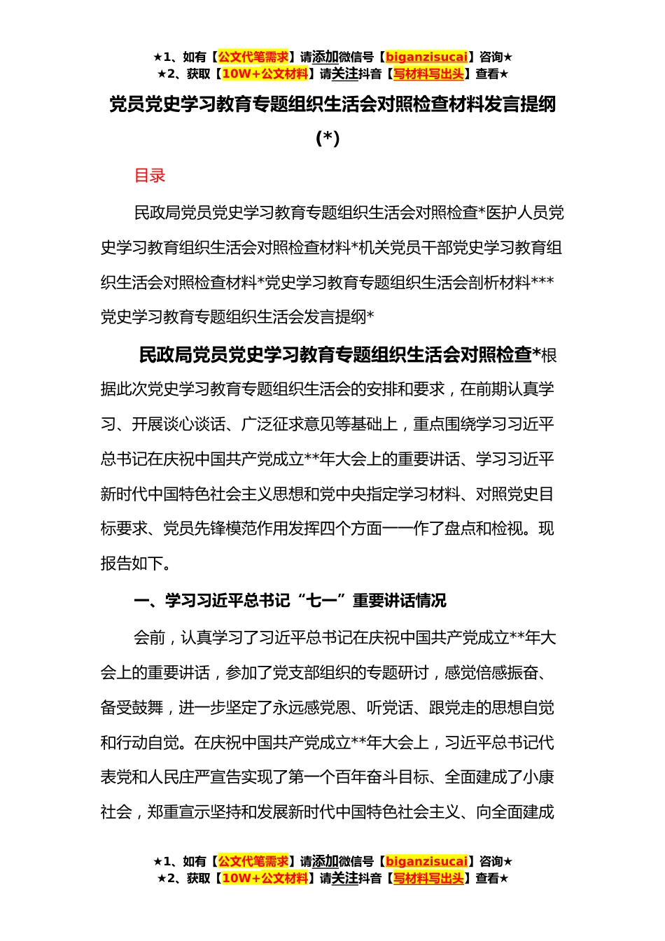 ★1、如有【公文代笔需求】请添加微信号【biganzisucai】咨询★★2、获取【10W+公文材料】请关注抖音【写材料写出头】查看★党员党史学习教育专题组织生活会对照检查材料发言提纲(*)目录民政局党员党史学习教育专题组织生活会对照检查*医护人员党史学习教育组织生活会对照检查材料*机关党员干部党史学习教育组织生活会对照检查材料*党史学习教育专题组织生活会剖析材料***党史学习教育专题组织生活会发言提纲*民政局党员党史学习教育专题组织生活会对照检查*根据此次党史学习教育专题组织生活会的安排和要求,在前期认真学习、开展谈心谈话、广泛征求意见等基础上,重点围绕学习习近平总书记在庆祝中国共产党成立**年大会上的重要讲话、学习习近平新时代中国特色社会主义思想和党中央指定学习材料、对照党史目标...