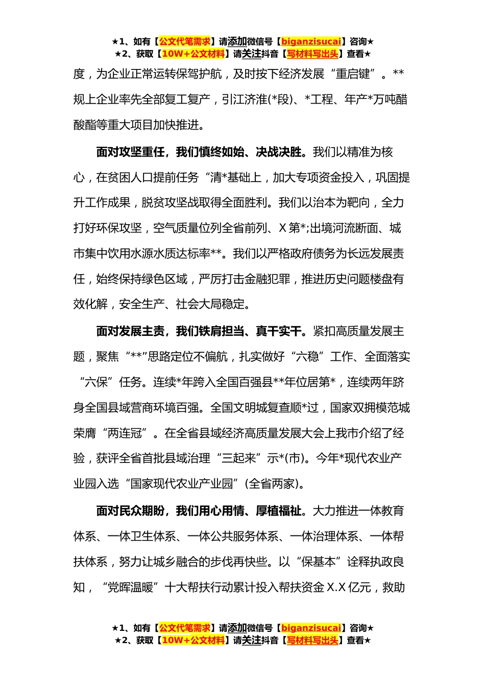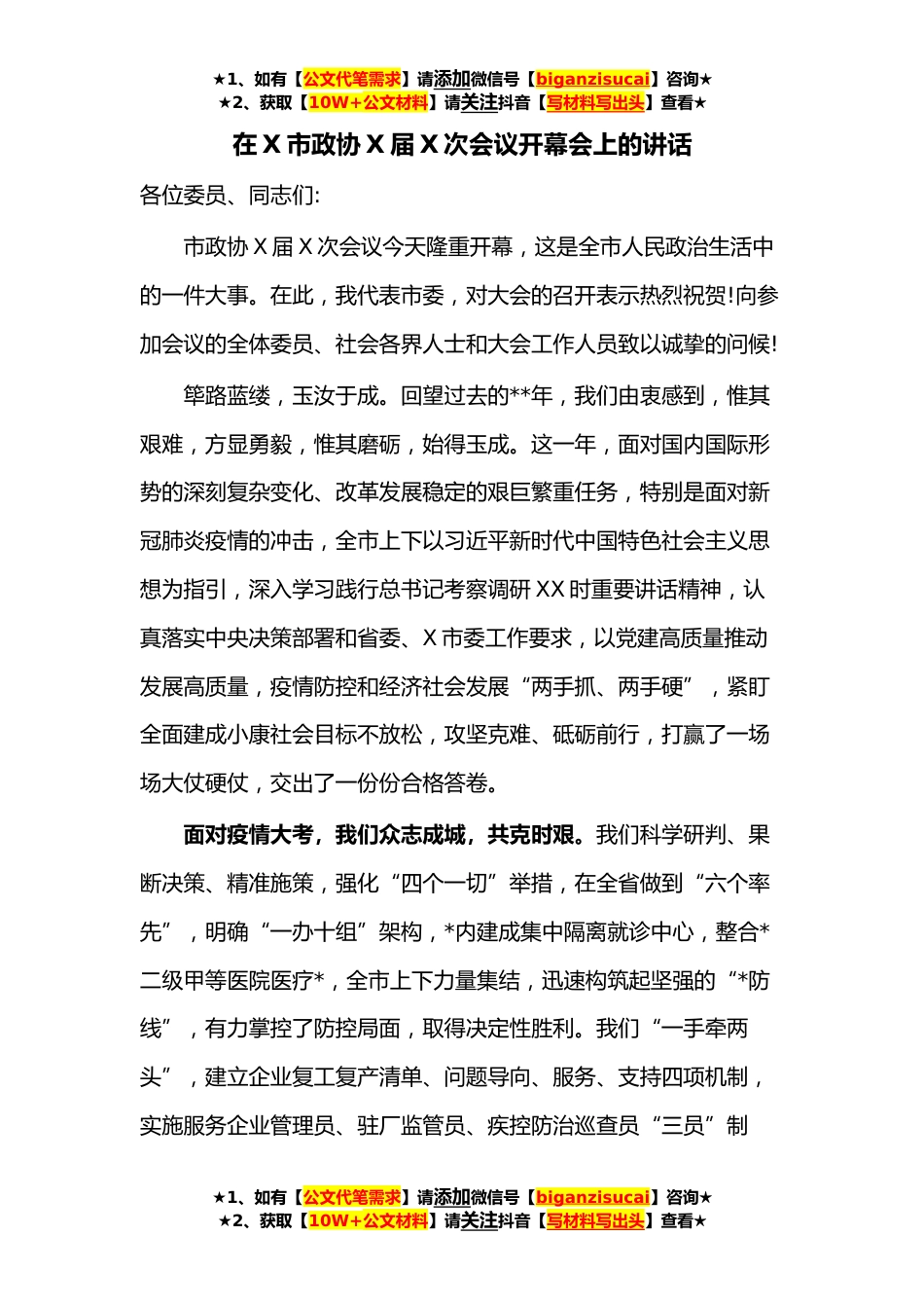 ★1、如有【公文代笔需求】请添加微信号【biganzisucai】咨询★★2、获取【10W+公文材料】请关注抖音【写材料写出头】查看★在X市政协X届X次会议开幕会上的讲话各位委员、同志们:市政协X届X次会议今天隆重开幕,这是全市人民政治生活中的一件大事。在此,我代表市委,对大会的召开表示热烈祝贺!向参加会议的全体委员、社会各界人士和大会工作人员致以诚挚的问候!筚路蓝缕,玉汝于成。回望过去的**年,我们由衷感到,惟其艰难,方显勇毅,惟其磨砺,始得玉成。这一年,面对国内国际形势的深刻复杂变化、改革发展稳定的艰巨繁重任务,特别是面对新冠肺炎疫情的冲击,全市上下以习近平新时代中国特色社会主义思想为指引,深入学习践行总书记考察调研XX时重要讲话精神,认真落实中央决策部署和省委、X市委工作要求,以...