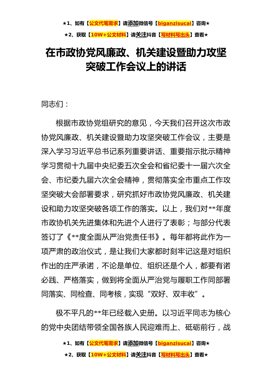 ★1、如有【公文代笔需求】请添加微信号【biganzisucai】咨询★★2、获取【10W+公文材料】请关注抖音【写材料写出头】查看★★1、如有【公文代笔需求】请添加微信号【biganzisucai】咨询★★2、获取【10W+公文材料】请关注抖音【写材料写出头】查看★★1、如有【公文代笔需求】请添加微信号【biganzisucai】咨询★★2、获取【10W+公文材料】请关注抖音【写材料写出头】查看★在市政协党风廉政、机关建设暨助力攻坚突破工作会议上的讲话同志们:根据市政协党组研究的意见,今天我们召开这次市政协党风廉政、机关建设暨助力攻坚突破工作会议,主要是深入学习习近平总书记系列重要讲话、重要指示批示精神学习贯彻十九届中央纪委五次全会和省纪委十一届六次全会、市纪委九届六次全会精神,贯彻落实全市重点工作攻坚突...
