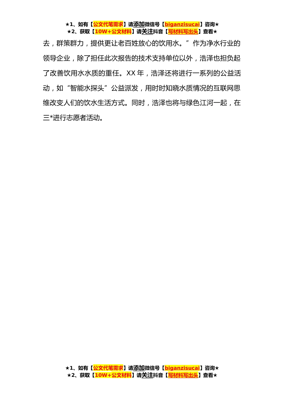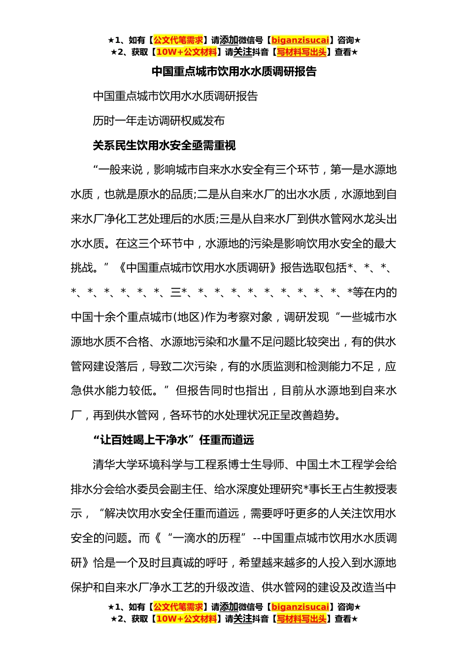 ★1、如有【公文代笔需求】请添加微信号【biganzisucai】咨询★★2、获取【10W+公文材料】请关注抖音【写材料写出头】查看★中国重点城市饮用水水质调研报告中国重点城市饮用水水质调研报告历时一年走访调研权威发布关系民生饮用水安全亟需重视“一般来说,影响城市自来水水安全有三个环节,第一是水源地水质,也就是原水的品质;二是从自来水厂的出水水质,水源地到自来水厂净化工艺处理后的水质;三是从自来水厂到供水管网水龙头出水水质。在这三个环节中,水源地的污染是影响饮用水安全的最大挑战。”《中国重点城市饮用水水质调研》报告选取包括*、*、*、*、*、*、*、*、*、三*、*、*、*、*、*、*、*、*、*、*等在内的中国十余个重点城市(地区)作为考察对象,调研发现“一些城市水源地水质不合格、水源地污染和...