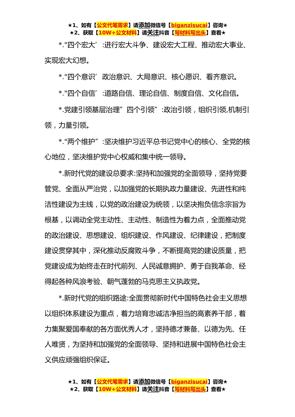 ★1、如有【公文代笔需求】请添加微信号【biganzisucai】咨询★★2、获取【10W+公文材料】请关注抖音【写材料写出头】查看★基层党建工作应知应会(*)1.党的性质:中国共产党是工人阶级的先锋队,同时是中国人*中华民族的先锋队,是中国特色社会主义事业的领导核心,代表中国先进生产力的进展要求,代表中国先进文化的*方向,代表中国最宽敞人民的根本利益。2.党的行动指南:马克思列宁主义、毛泽东思想、邓小平理论、”“三个代表”重要思想、科学进展观、习近平新时代中国特色社会主义思想。3.党的宗旨:一心一意为人民服务。4.党的最高抱负和最终目标:实现共产主义。5.党的三大历史任务:推动现代化建设、完成祖国统一、维护世界*与促进共同进展。6.党的"三大作风’:理论联系实际、亲密联系群众、批判和自我批判。7....