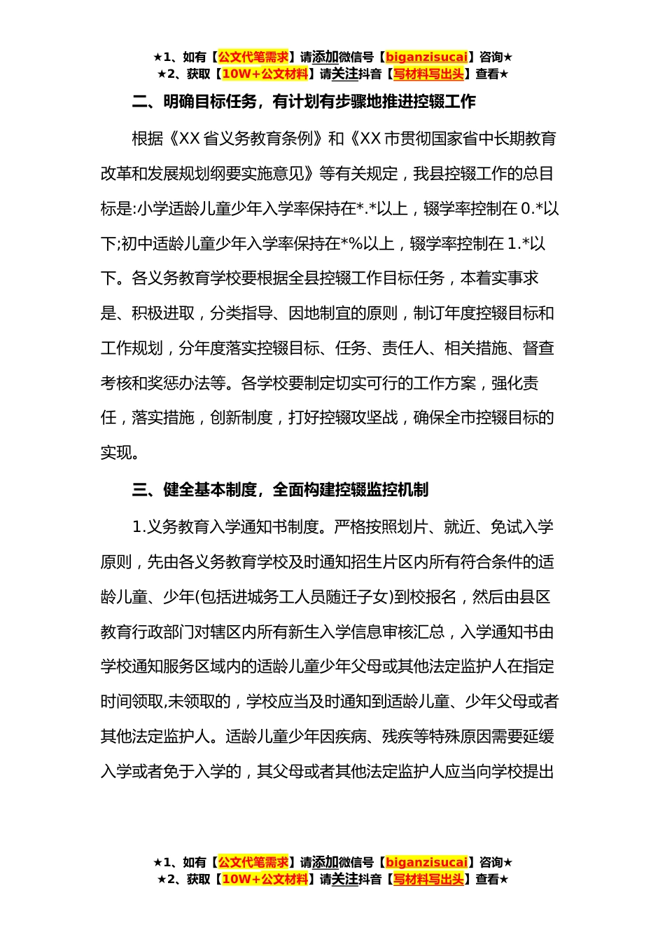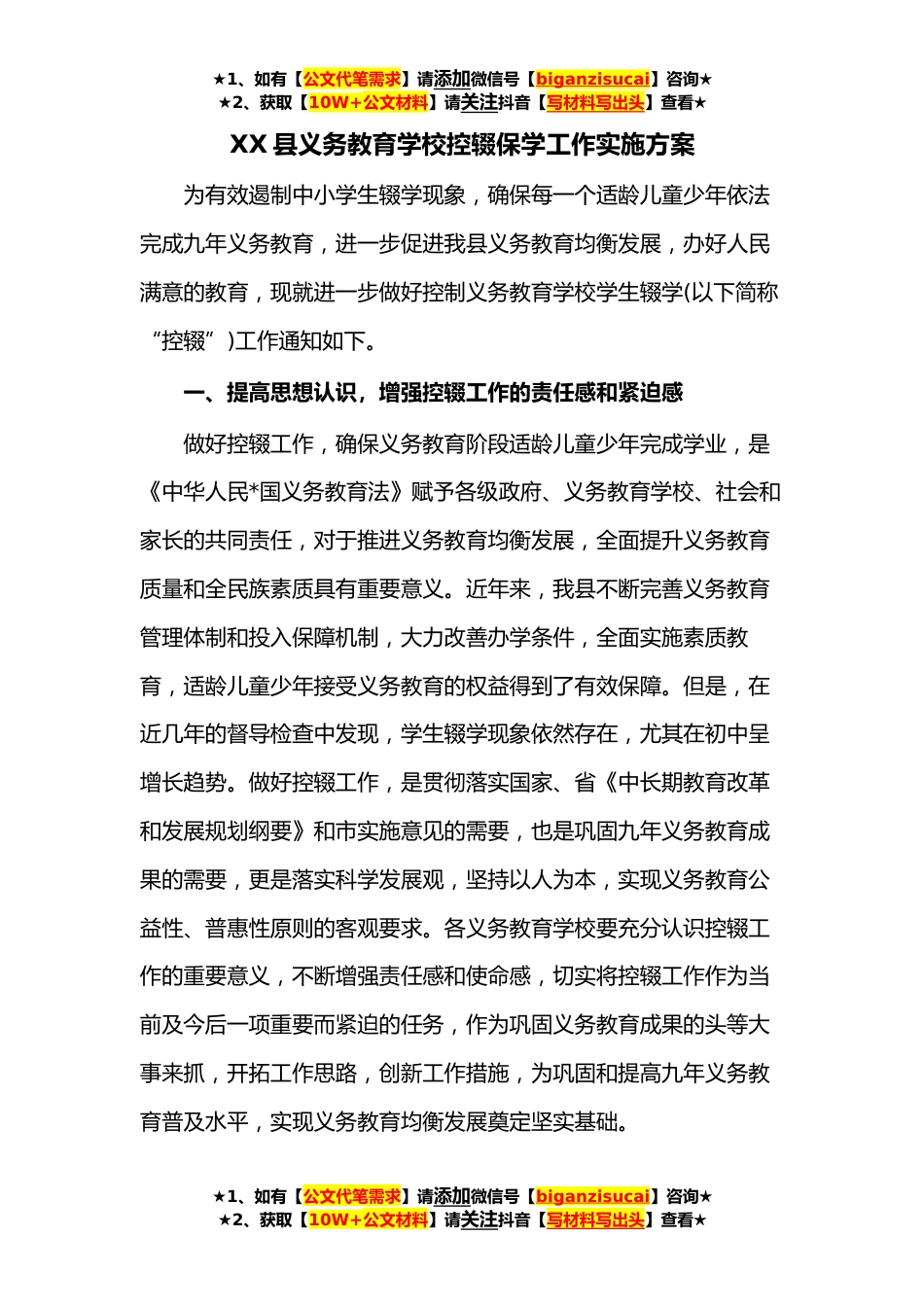 ★1、如有【公文代笔需求】请添加微信号【biganzisucai】咨询★★2、获取【10W+公文材料】请关注抖音【写材料写出头】查看★XX县义务教育学校控辍保学工作实施方案为有效遏制中小学生辍学现象,确保每一个适龄儿童少年依法完成九年义务教育,进一步促进我县义务教育均衡发展,办好人民满意的教育,现就进一步做好控制义务教育学校学生辍学(以下简称“控辍”)工作通知如下。一、提高思想认识,增强控辍工作的责任感和紧迫感做好控辍工作,确保义务教育阶段适龄儿童少年完成学业,是《中华人民*国义务教育法》赋予各级政府、义务教育学校、社会和家长的共同责任,对于推进义务教育均衡发展,全面提升义务教育质量和全民族素质具有重要意义。近年来,我县不断完善义务教育管理体制和投入保障机制,大力改善办学条件,...